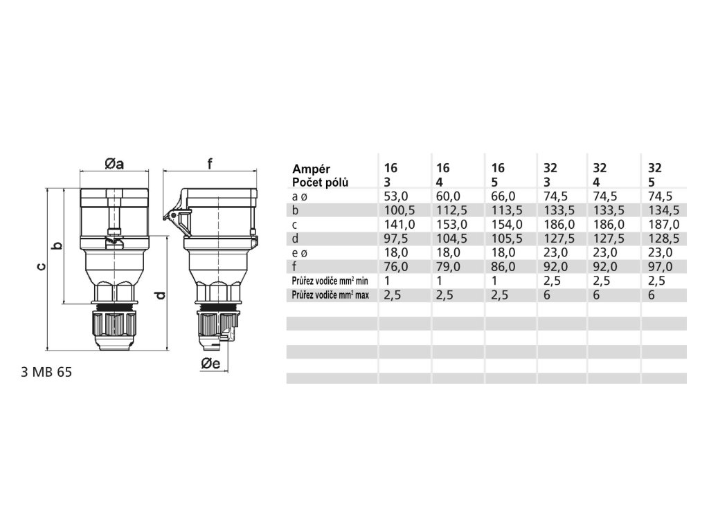 CEE spojka, Quick-Connect, Multi-Grip 32A 5p (3P+N+PE) 400V (200/346 do 240/415V~) 6h IP44 frekvence: 50 a 60Hz kód barvy: červená RAL 3000 kontakty: nosič kontaktů je vyroben z polyamidu, kontakty jsou vyrobeny z mosazi maximální průřez vodiče: 6,0 mm2 materiál krytu: polyamid systém připojení: bezšroubové pružinové klecové svorky přívod kabelu: kabelová vývodka barva: pouzdro červené, límec červený, víčko sklopné červené, kabelová vývodka šedá rozměry: výška 188 mm, šířka 79 mm, hloubka 102 mm další technické vlastnosti: pro průměr kabelu od 11 do max. 23,5 mm bezšroubové připojení vodičů QUICK-CONNECT je ověřený, trvanlivý, bezpečný a zcela bezúdržbový systém odolný proti nárazům, vibracím a výkyvům teplot. QUICK-CONNECT s optimálně nastaveným přítlakem svorky na připojovaný vodič zcela eliminuje nedostatky šroubových spojení (možnost přetažení, nebo nedotažení šroubků, slaněné vodiče není třeba ukončovat dutinkami) barevné označení vstupů, pro správné zapojení jednotlivých vodičů (dodržení sledu fází u třífázové elektrické soustavy) unikátní kabelová vývodka MULTI-GRIP s integrovaným těsněním a spolehlivým odlehčením tahu kabelu. Pevnost v tahu mnohonásobně překračuje hodnoty požadované normami IEC 60309, EN 60309 a VDE 0623. Vývodka MULTI-GRIP s ochranou proti samovolnému povolení vlivem vibrací, nebo teplotních rozdílů, vhodná i do náročných klimatických podmínek, odolná prachu a mastnotě. Vývodka dosahuje třídy ochrany min. IP67Doplňkové parametry