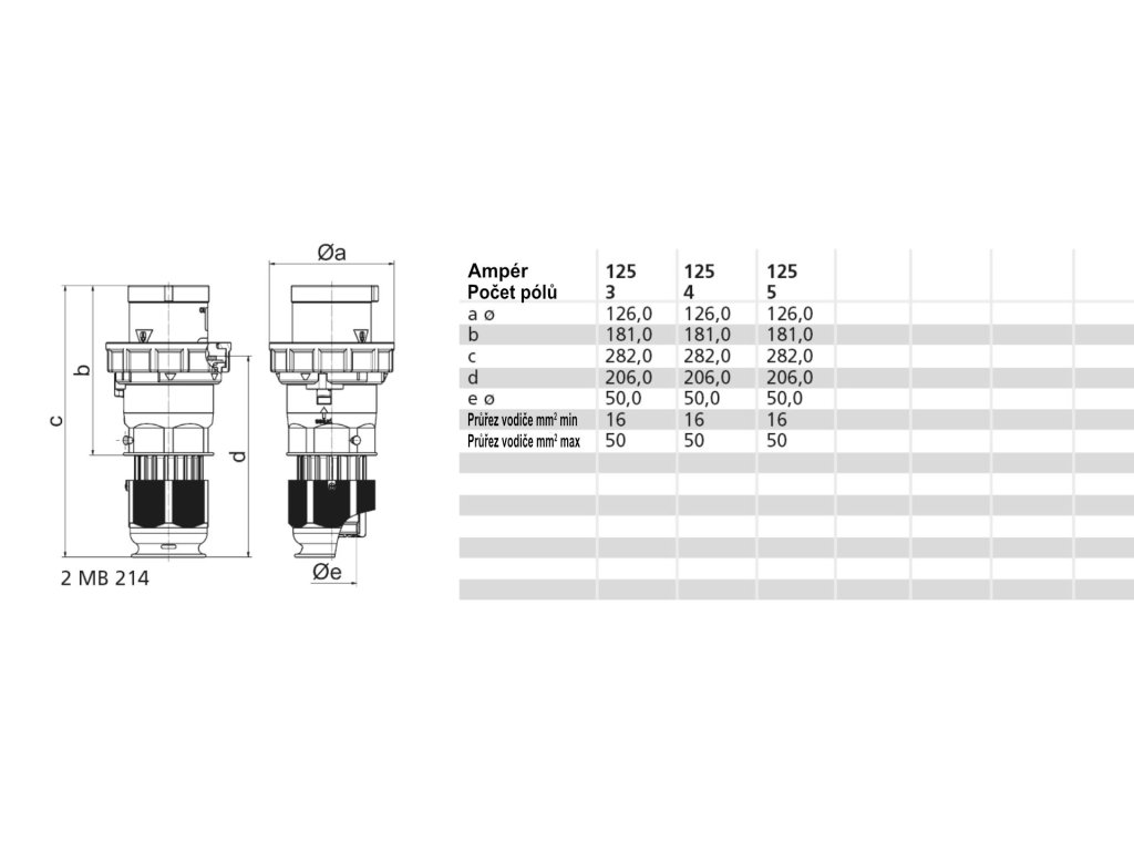 CEE vidlice, Multi-Grip 125A 5p (3P+N+PE) 400V (200/346 do 240/415V~) 6h IP67 frekvence: 50 a 60Hz kód barvy: červená RAL 3000 kontakty: nosič kontaktů je vyroben z materiálu odolného vůči vysokým teplotám, kontakty jsou vyrobeny z mosazi, povrch kontaktů je poniklovaný maximální průřez vodiče: 50,0 mm2 materiál krytu: polykarbonát + polyester systém připojení: šroubová rámová svorka přívod kabelu: kabelová vývodka barva: zajišťovací kolík šedý, pouzdro červené, límec červený, bajonetový uzávěr šedý, kabelová vývodka šedá rozměry: výška 282 mm, šířka 126 mm, hloubka 126 mm další technické vlastnosti: pro průměr kabelu od 26 do max. 50 mm unikátní kabelová vývodka MULTI-GRIP s integrovaným těsněním a spolehlivým odlehčením tahu kabelu. Pevnost v tahu mnohonásobně překračuje hodnoty požadované normami IEC 60309, EN 60309 a VDE 0623. Vývodka MULTI-GRIP s ochranou proti samovolnému povolení vlivem vibrací, nebo teplotních rozdílů, vhodná i do náročných klimatických podmínek, odolná prachu a mastnotě. Vývodka dosahuje třídy ochrany min. IP67Doplňkové parametry
