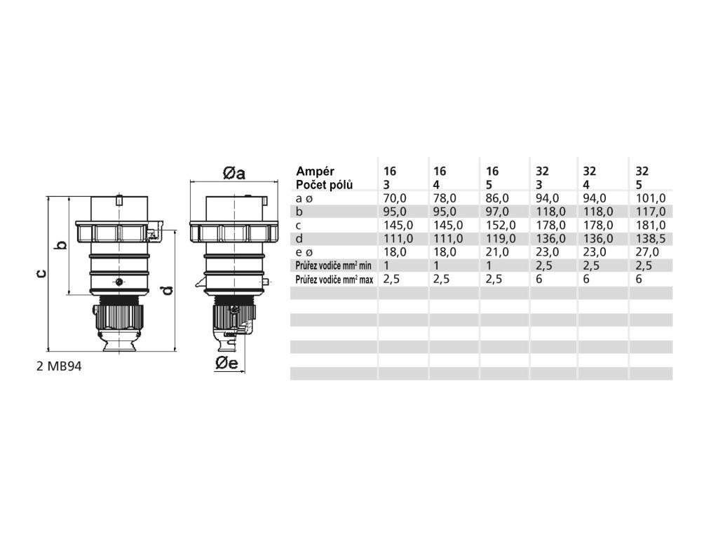 CEE vidlice, Quick-Connect, Multi-Grip 32A 5p (3P+N+PE) 400V (200/346 do 240/415V~) 6h IP67 frekvence: 50 a 60Hz kód barvy: červená RAL 3000 kontakty: nosič kontaktů je vyroben z materiálu odolného vůči vysokým teplotám, kontakty jsou vyrobeny z mosazi, povrch kontaktů je poniklovaný maximální průřez vodiče: 6,0 mm2 materiál krytu: polyamid systém připojení: bezšroubové pružinové klecové svorky přívod kabelu: kabelová vývodka barva: pouzdro červené, límec červený, bajonetový uzávěr šedý, kabelová vývodka šedá rozměry: výška 182 mm, šířka 102 mm, hloubka 102 mm další technické vlastnosti: pro průměr kabelu od 13 do max. 27 mm bezšroubové připojení vodičů QUICK-CONNECT je ověřený, trvanlivý, bezpečný a zcela bezúdržbový systém odolný proti nárazům, vibracím a výkyvům teplot. QUICK-CONNECT s optimálně nastaveným přítlakem svorky na připojovaný vodič zcela eliminuje nedostatky šroubových spojení (možnost přetažení, nebo nedotažení šroubků, slaněné vodiče není třeba ukončovat dutinkami) barevné označení vstupů, pro správné zapojení jednotlivých vodičů (dodržení sledu fází u třífázové elektrické soustavy) unikátní kabelová vývodka MULTI-GRIP s integrovaným těsněním a spolehlivým odlehčením tahu kabelu. Pevnost v tahu mnohonásobně překračuje hodnoty požadované normami IEC 60309, EN 60309 a VDE 0623. Vývodka MULTI-GRIP s ochranou proti samovolnému povolení vlivem vibrací, nebo teplotních rozdílů, vhodná i do náročných klimatických podmínek, odolná prachu a mastnotě. Vývodka dosahuje třídy ochrany min. IP67Doplňkové parametry