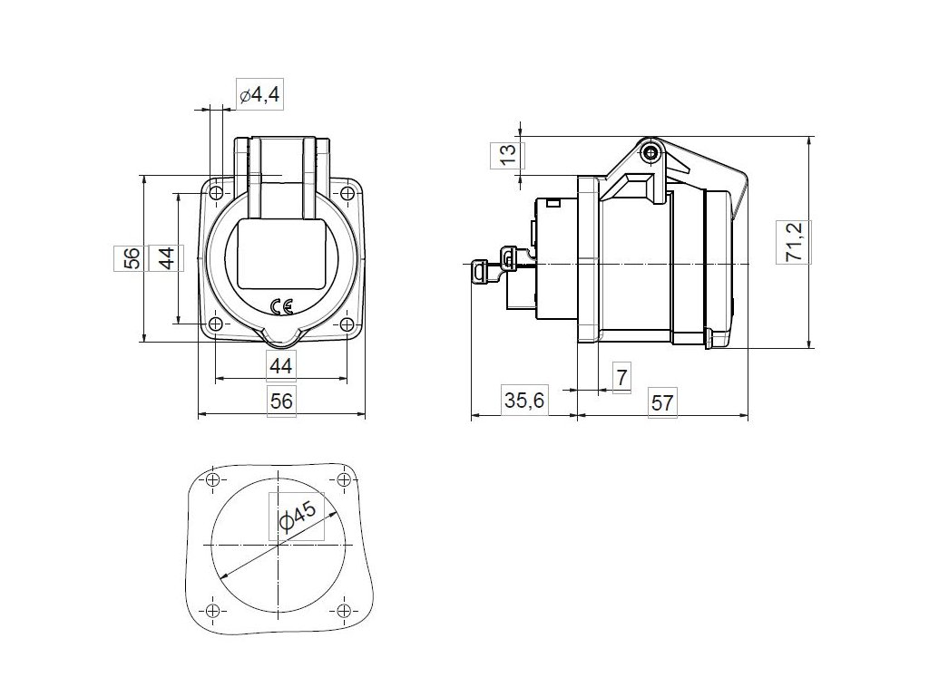 CEE zásuvka vestavná přímá, Quick-Connect 16A 3p (2P+PE) 230V (200 do 250V~) 6h IP44 frekvence: 50 a 60Hz kód barvy: modrá RAL 5015 kontakty: nosič kontaktů je vyroben z polyamidu, kontakty jsou vyrobeny z mosazi maximální průřez vodiče: 4,0 mm2 materiál krytu: polyamid způsob připojení: bezšroubové pružinové klecové svorky barva: víčko sklopné modré, kryt šedý rozměr příruby: svisle 56 mm, vodorovně 56 mm rozteč montážních otvorů: vodorovně 44 mm, svisle 44 mm rozměry: výška 89 mm, šířka 56 mm, hloubka 72 mm další technické vlastnosti: bezšroubové připojení vodičů QUICK-CONNECT je ověřený, trvanlivý, bezpečný a zcela bezúdržbový systém odolný proti nárazům, vibracím a výkyvům teplot. QUICK-CONNECT s optimálně nastaveným přítlakem svorky na připojovaný vodič zcela eliminuje nedostatky šroubových spojení (možnost přetažení, nebo nedotažení šroubků, slaněné vodiče není třeba ukončovat dutinkami) barevné označení vstupů, pro správné zapojení jednotlivých vodičů (dodržení sledu fází u třífázové elektrické soustavy)Doplňkové parametry
