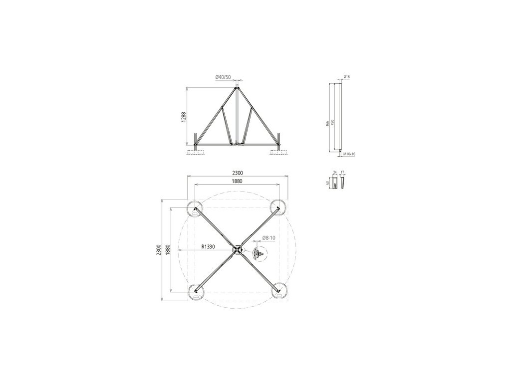 Čtyřramenný stojan (rozkládací verze) pro podpůrné trubky D 50 mm se stranovým vývodem nebo s redukcí pro jímací tyče D 40 mm. S dvojitou příložkou pro připojení dvou drátů prům. 8 - 10 mm, sestavení s betonovými podstavci (hmotnost 17 kg) a přizpůsobením sklonu střechy do max. 10° pomocí sady upevňovacích tyčí pro betonové podstavce.Doplňkové parametry