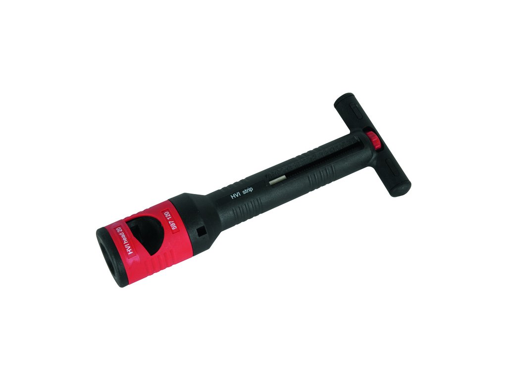 Nástroj HVI strip 20 umožňuje odstranit polovodivý plášť a současně PE izolaci z vodiče HVI, HVI light plus a HVI light s vnějším průměrem 20 mm. Délku odizolování lze regulovat v krocích po 0,2 mm pomocí krokovacího kolečka na rukojeti. Provedení kompletní s rukojetí a hlavou s noži.Doplňkové parametry