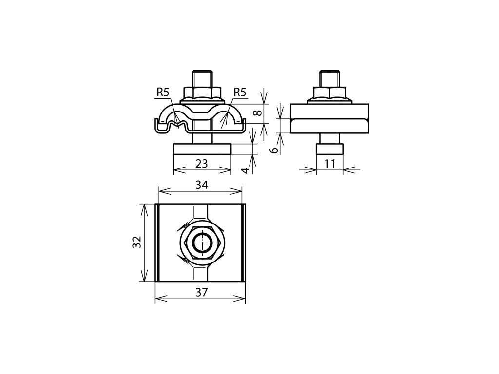 Uzemňovací svorka UNI podle normy DIN EN 62561-1, pro propojení montážních systémů, např. FV zařízení s funkčním vyrovnáním potenciálů / funkčním uzemněním (barva vodiče může být černá) a vyrovnáním potenciálů ochrany před bleskem podle normy DIN EN 62305-3 (VDE 0185-305-3). Prostřednictvím kontaktní plochy (mezikus) z nerezu mohou být propojeny vodiče z různých materiálů (Cu, Al, FeZn a nerez) s běžnou montážní konstrukcí např. z hliníku bez rizika vzniku elektrochemické koroze. Provedení se šroubem s kladívkovou hlavou M8 x 30 mm, přírubovou maticí s ozubením a dvojitou příložkou např. pro průchozí zapojení profilů.Doplňkové parametry