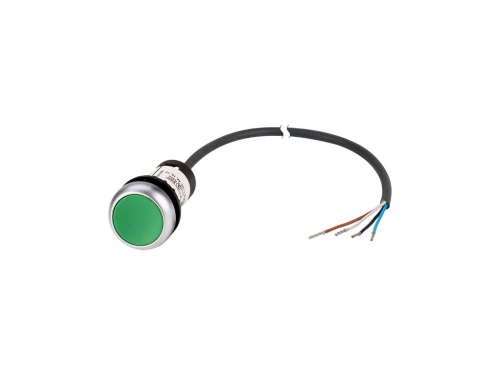 Tlačítko, RMQ compact solution, Kompletní přístroj, Konstrukční typ: plochý, bez aretace, Typ připojení: Kabel (černý) s otevřeným koncem, 4-pólový, Délka kabelu: 1 M, Tlačítkový výplň: zelený, Panel s tlačítky nepopsaný, Popis: bez, Stupeň krytí: IP66, IP67, IP69K (čelní), IP65 (zadní), Čelní kroužek: titanový, Připojení na SmartWire-DT: ne, S = spínací kontakt: 1 spínací kontakt, Normy a ustanovení: IEC/EN 60947-5-1, VDE 0660Doplňkové parametry