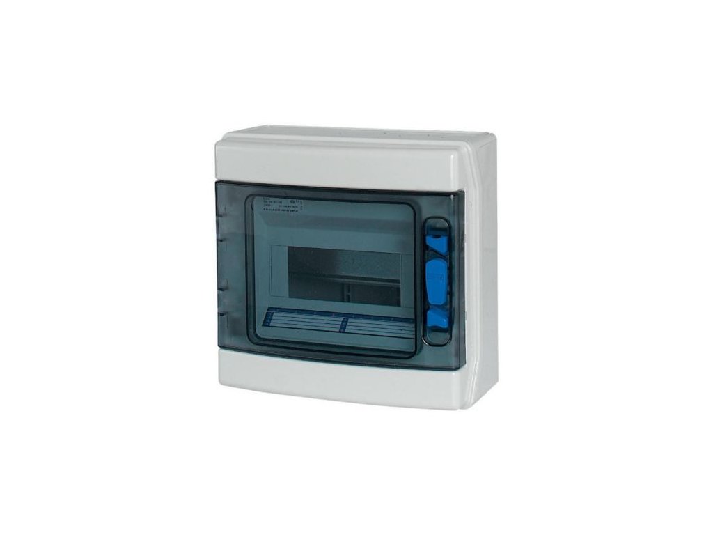 IKA distribution board for damp locations RAL7035, with neutral and protective conductor terminal, foamed-in-place gasket, applied using CNC, for IP65 degree of protection as per IEC/EN 62208, 8 space units, 1-row, approved for building service distribution boards in accordance with IEC/EN 61439-3 VDE 0660-600-3, integrated module compensation system designed to accommodate various device widths, metric knockouts with centering point, enclosure made of ABS and door made of polycarbonates, for installing switching and protective devices, in accordance with dimension standard DIN 43 880, with an installation depth of 70 mm, AC 1000 V , DC 1500 V, RoHs-compliant, consisting of a plastic base with a DIN-rail made of galvanized sheet steel, direct mounting wall mounting holes, finger-proof IP2X neutral and protective conductor terminals, knockout for metric cable entries on top and bottom, side knockouts for connection element for connecting two or more enclosures next to each other, top with 46-mm device opening, transparent door, flush with front, can be fitted on the right or left, door handing can be easily changed on-site without having to remove the enclosure top., enclosure top with sealable quick-release fasteners, door lockable with accessories LOCK-KIT-IKA , door can be sealed, including blanking strip and inscription labels.Doplňkové parametry