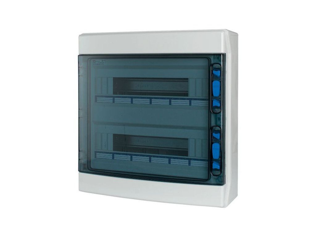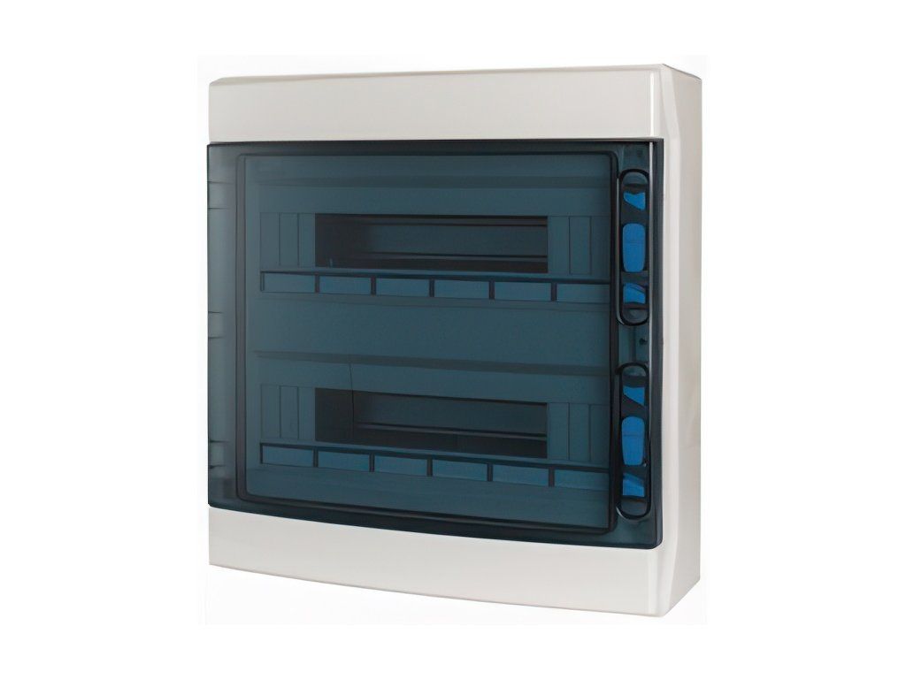 IKA distribution board for damp locations RAL7035, with neutral and protective conductor terminal, foamed-in-place gasket, applied using CNC, for IP65 degree of protection as per IEC/EN 62208, 36 space units, 2-row, approved for building service distribution boards in accordance with IEC/EN 61439-3 VDE 0660-600-3, integrated module compensation system designed to accommodate various device widths, metric knockouts with centering point, enclosure made of ABS and door made of polycarbonates, for installing switching and protective devices, in accordance with dimension standard DIN 43 880 with an installation depth of 70 mm or 85 mm, AC 1000 V , DC 1500 V, RoHs-compliant, consisting of a plastic base with a withdrawable DIN-rail made of galvanized sheet steel, DIN-rail adjustable in height in 2 positions, direct mounting wall mounting holes, finger-proof IP2X neutral and protective conductor terminals, knockout for metric cable entries on top and bottom, side knockouts for connection element for connecting two or more enclosures next to each other, top with 46-mm device opening, transparent door, flush with front, can be fitted on the right or left, door handing can be easily changed on-site without having to remove the enclosure top. , enclosure top with sealable quick-release fasteners, door lockable with accessories LOCK-KIT-IKA, door can be sealed, including blanking strip and inscription labels.Doplňkové parametry