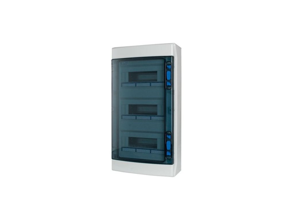 IKA distribution board for damp locations RAL7035, with neutral and protective conductor terminal, foamed-in-place gasket, applied using CNC, for IP65 degree of protection as per IEC/EN 62208, 36 space units, 3-row, approved for building service distribution boards in accordance with IEC/EN 61439-3 VDE 0660-600-3, integrated module compensation system designed to accommodate various device widths, metric knockouts with centering point, enclosure made of ABS and door made of polycarbonates, for installing switching and protective devices, in accordance with dimension standard DIN 43 880 with an installation depth of 70 mm or 85 mm, AC 1000 V , DC 1500 V, RoHs-compliant, consisting of a plastic base with a withdrawable DIN-rail made of galvanized sheet steel, DIN-rail adjustable in height in 2 positions, direct mounting wall mounting holes, finger-proof IP2X neutral and protective conductor terminals, knockout for metric cable entries on top and bottom, side knockouts for connection element for connecting two or more enclosures next to each other, top with 46-mm device opening, transparent door, flush with front, can be fitted on the right or left, door handing can be easily changed on-site without having to remove the enclosure top. , enclosure top with sealable quick-release fasteners, door lockable with accessories LOCK-KIT-IKA, door can be sealed, including blanking strip and inscription labels.Doplňkové parametry