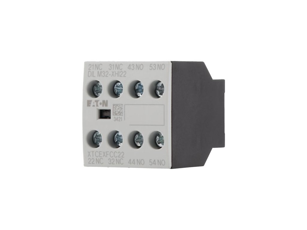 Blok pomocných kontaktů, S nuceně vedenými kontakty, Funkce: pro standardní aplikace, 4-pólové, Typy svorek: Šroubové svorky, Jmenovitý pracovní proud AC-15 220 V 230 V 240 V: Ie= 4 A, Jmenovitý pracovní proud AC-15 380 V 400 V 415 V: Ie= 4 A, Kontakty S = spínací kontakt: 2 spínací kontakt, Kontakty Ö = rozpínací kontakt: 2 rozpínací kontakt, Druh montáže: Montáž do panelu, Použitelný pro: DILM(C)7-10…, DILM(C)9-10…, DILM(C)12-10…, DILM(C)15-10…, DILM(C)17-10…, DILM(C)25-10…, DILM(C)32-10…, DILM38-10…, DILMP20…, DILMP32-10…, DILMP45-10…, DILL…, DILMF8-10…, DILMF11-10…, DILMF14-10…, DILMF17-10…, DILMF25-10…, DILMF32-10…, Provedení: Vrchní pomocný kontakt, Poznámky: Kontakty s nuceným vedením podle ČSN/EN 60947-5-1 Příloha L, uvnitř bloku pomocných kontaktů a integrovaných pomocných kontaktů DILM 7 - DILM32, Pomocné rozpínací kontakty lze použít jako zrcadlový kontakt podle ČSN EN 60947-4-1 Příloha F (nikoli zpožděný rozpínací kontakt)Doplňkové parametry