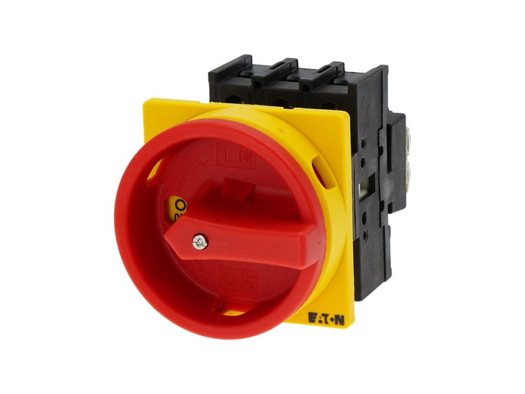 Hlavní spínač, Sortiment: Hlavní vypínač, Přepínač údržby, Označení typu: P1, Funkce STOP: Funkce nouzového vypnutí, S červenou otočnou ovládací pákou a žlutou objímkou, Informace k rozsahu dodávky: Pomocný kontakt nebo neutrální vodič lze namontovat dodatečně., 3-pólové, Možnost uzamčení: Uzamykatelný v poloze 0, Stupeň krytí: Vpředu IP65, Provedení: Montáž do panelu, Výkon motoru AC-23A, 50 - 60 Hz 400 V: P = 15 kW, Jmenovitý trvalý proud: Iu = 32 A, Normy a ustanovení: IEC/EN 60947, VDE 0660, IEC/EN 60204, CSA, UL, Switch-disconnector according to IEC/EN 60947-3, NEMA12Doplňkové parametry