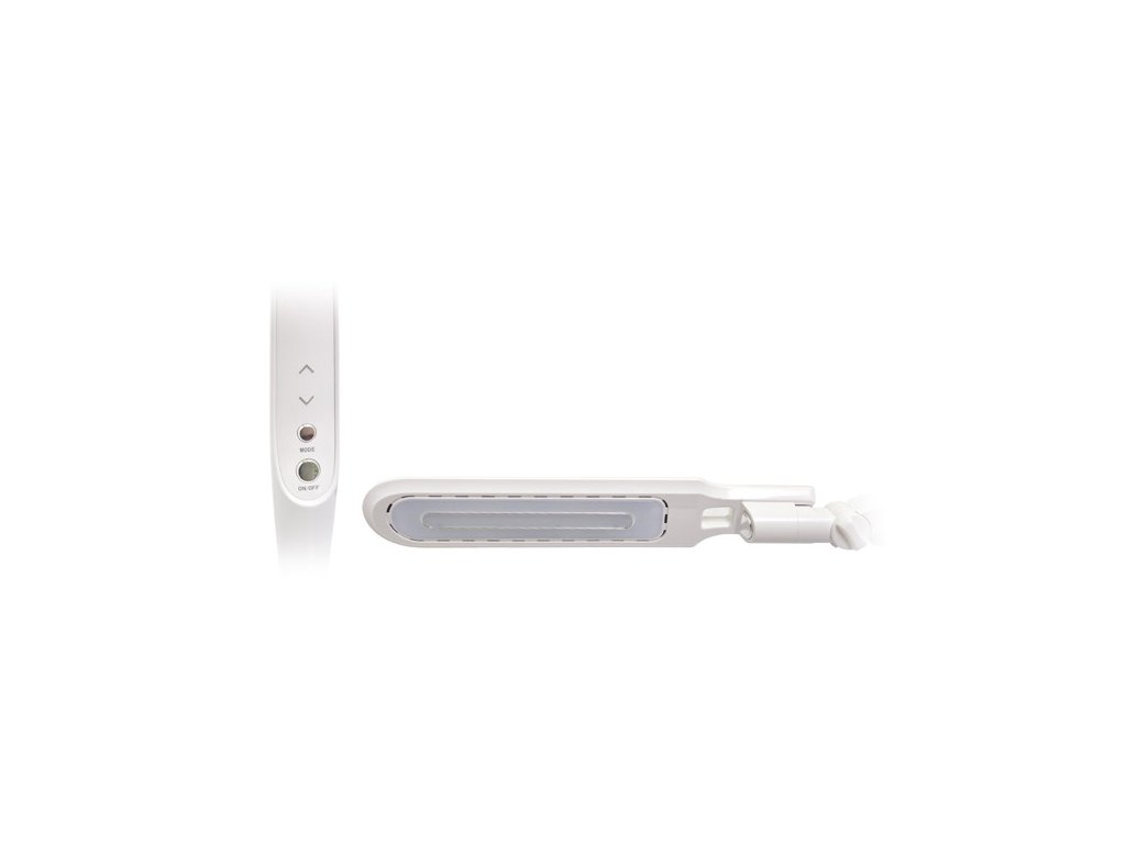 Moderní stmívatelná kancelářská lampička typu pantograf pro osvětlení pracovního prostoru stolu. Využívá vysoce úspornou SMD LED technologii s dlouhou životností. Tělo lampy je opatřeno otočnými klouby pro pohodlné nastavení polohy dle potřeby. Ovládání umožňuje plynulé měnění intenzity osvětlení a změnu barvy světla (teplé, neutrální a studené). Součástí balení podstavec i šroubová svorka pro upevnění ke stolu.Doplňkové parametry