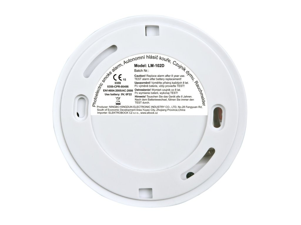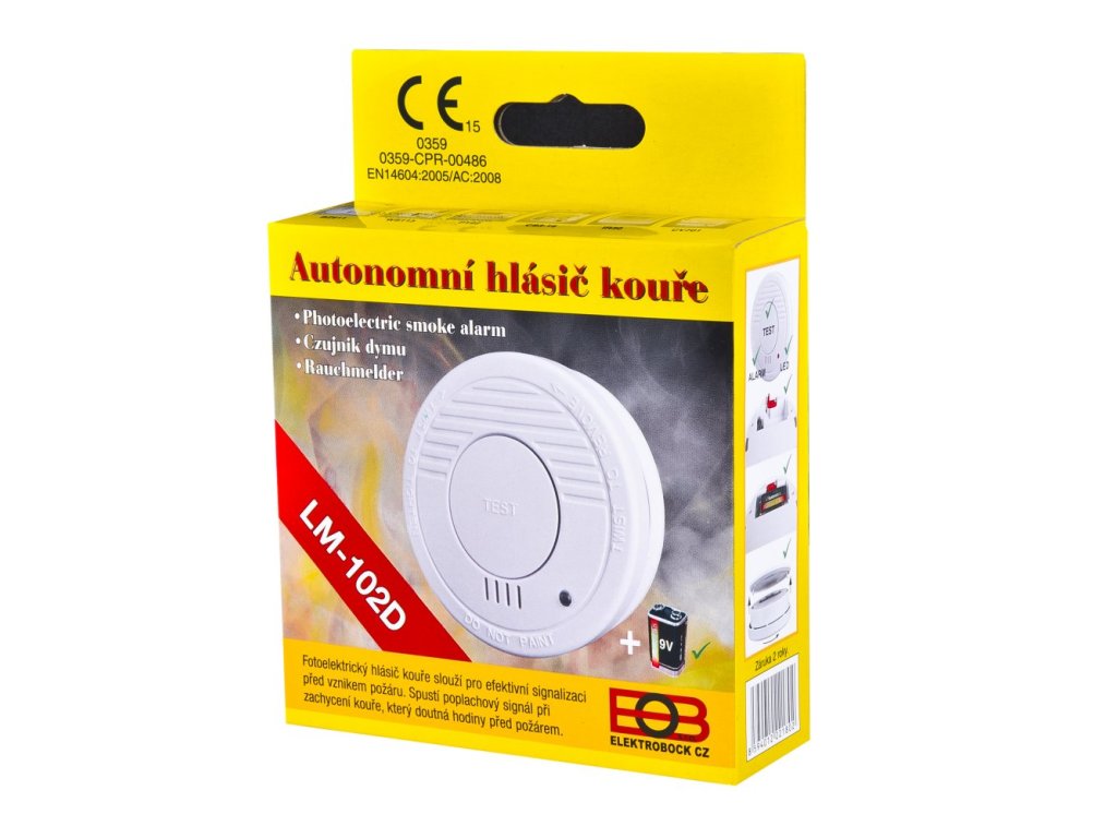 <h2> Vlastnosti autonomního hlásiče kouře LM-102D:</h2> <p> Tento hlásič pracuje na principu rozptýleného světla. Reaguje i na nejmenší množství kouře, které vnikne do krytu detektoru.</p> <p> <strong>LM-102D splňuje požadavky vyhlášky ” o technických podmínkách požární ochrany staveb “ (zákon 23/2008 sb.) platné od 1.7.2008, která mimo jiné nařizuje vybavit nové bytové domy a rodinné domy autonomními hlásiči!!</strong></p> <p> </p> <h3> Výhody LM-102D:</h3> <ul> <li> pracuje na principu rozptýleného světla</li> <li> konstrukční řešení zabraňuje montáži bez baterie</li> <li> optická i akustická indikace slabé baterie</li> <li> rychlé testování tlačítkem na vrchním krytu přístroje</li> </ul>Doplňkové parametry