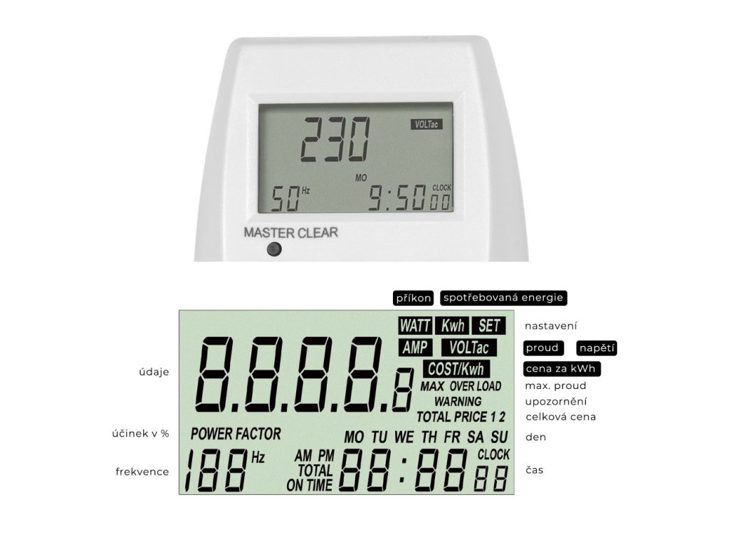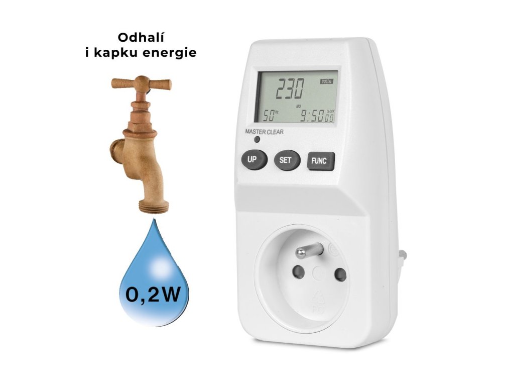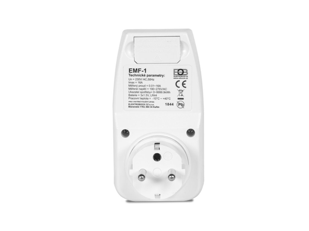 <h2> Vlastnosti EMF-1:</h2> <p> Patří mezi nejpřesnější přístroje tohoto typu. Je tak citlivý, že zaznamená i spotřebu doutnavky. Z dalších veličin zobrazuje napětí, proud až 16A, cos ? (pro přesný výpočet spotřebované energie). Vypočítává spotřebovanou energii za časové období až 9999 dní a max. 9999,9 kWh a přepočítává ji na finanční částku v EUR. Cenu za odebranou energii lze nastavit ve dvou tarifech podle času (NT a VT).<br /> Zálohovací baterie (vyměnitelné) umožní uchování dat a nastavení po dobu delší jak 3 měsíce. Přesnost měření je +-1%. Zásuvka je vybavena dětskou pojistkou.</p> <h2> Výhody EMF-1:</h2> <ul> <li> zobrazuje aktuální čas, napětí a frekvenci sítě, proud a příkon spotřebiče, účiník</li> <li> zaznamenává maximální příkon a spotřebu el.energie za dobu připojení</li> <li> lze nastavit 2 tarify (dvě různé ceny pro určité hodiny/dny)</li> </ul> <p> Přesnost měřícího přístroje je uvedena v tabulce, ale není úředně ověřena a garantována, jako je tomu např. u elektroměru. Proto považujte naměřené hodnoty pouze za orientační zjištění spotřeby.</p> <p> </p>Doplňkové parametry