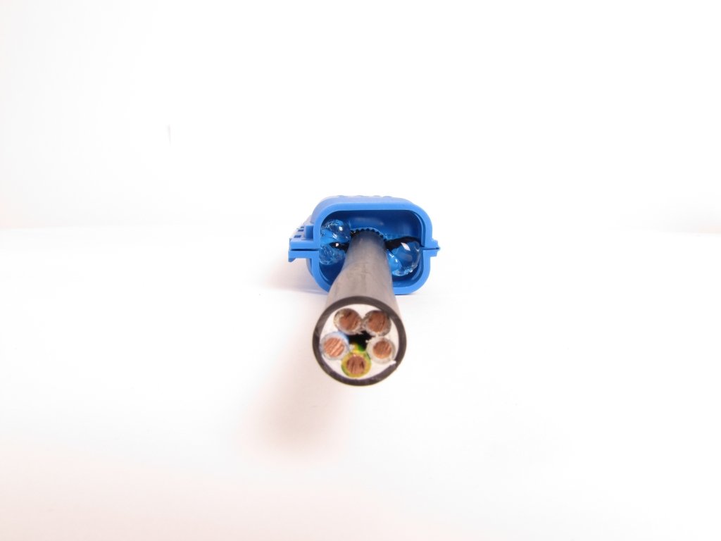 Spojka gelová kabelová SHARK 516 pro přímé spojení 3 až 5 žilových kabelů (s měděnými vodiči) od průřezů 6 až 16 mm2, svorkovnice součástí, pro Cu/Al, krytí IPX8.Pro spojování kabelů pod zemí, na vzduchu i v kanálových žlabech. Gelová hmota, která je předvyplněna z výroby, zajistí spolehlivé přilnutí ke kabelu a svorce. Vlhkost, voda ani žádné další nečistoty se již nedostanou ke spoji. Spoj je možné opětovně rozebrat. Vyrábí se ve 2 typových řadách - inovovaná SHARK SIXEIGHT a standardní řada spojek SHARK. V sortimentu jsou spojky jak pro jedno-žilové kabely, tak pro více-žilové kabely a to od průřezů 1,5 mm2 až po 240 mm2. Gel obsažený ve spojkách je bez data expirace, to znamená s neomezenou dobou použitelnosti. Jmenovité napětí až 0,6/1 kV.