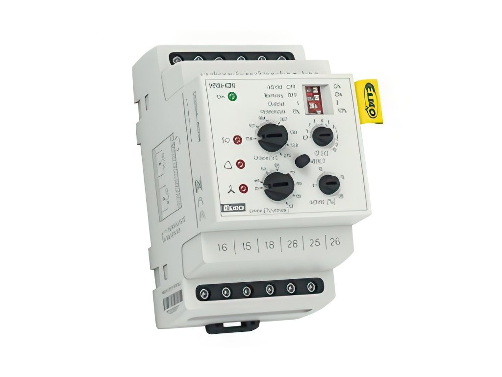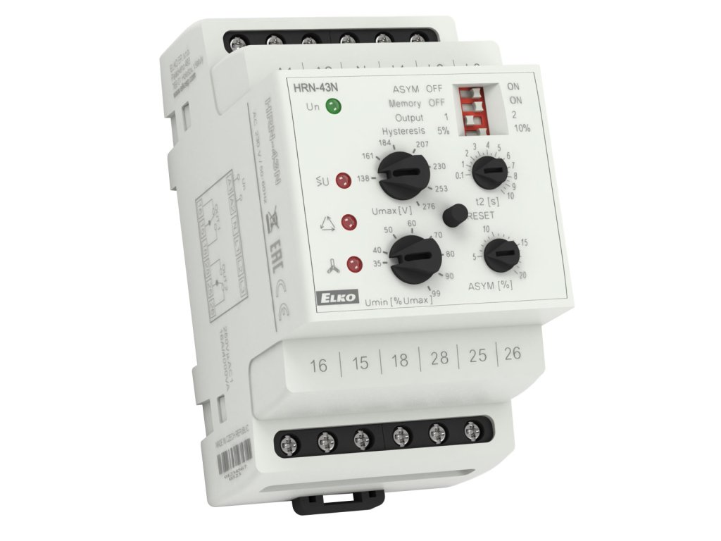 Hlídací relé s kompletní kontrolou se používá pro 3-fázovou kontrolu v síti, kontrolu a ochranu sítě, regulaci napětí z generátoru nebo vodní elektrárny. POPIS V 3-fázových sítích hlídá a kontroluje: a) Napětí v dvou úrovních (přepětí a podpětí). b) Asymetrii fází c) Pořadí fází d) Výpadek fáze Nastavitelná funkce PAMĚŤ – pro návrat z chybového do normálního stavu je treba stisknout tlačítko RESET. Funkce druhého relé (samostatně/paralelně). Pevné zpoždění T1 (200ms) a nastavitelné zpoždění T2 (0.1 – 10 s) pro eliminaci krátkodobých výpadků a špiček. Hlídací relé v dvou provedeních: HRN-43: určené pro obvody bez nulového vodiče (3 x 400 V) HRN-43N: určené pro obvody s nulovým vodičem (3 x 400 V/230 V) TECHNICKÉ PARAMETRY Napájecí napětí AC 230 V, AC 400 V, AC/DC 24 V, galvanicky oddělené. Horní úroveň (Umax): HRN-43: 240 – 480 V HRN-43N: 138 – 276 V Spodní úroveň (Umin): 35 – 99% kontrolovaného napětí. Výstupní kontakt: 2x přepínací 16 A/250 V AC1 (AgNi, 2500 VA). V provedení 3-MODUL, upevnění na DIN lištu.Doplňkové parametry