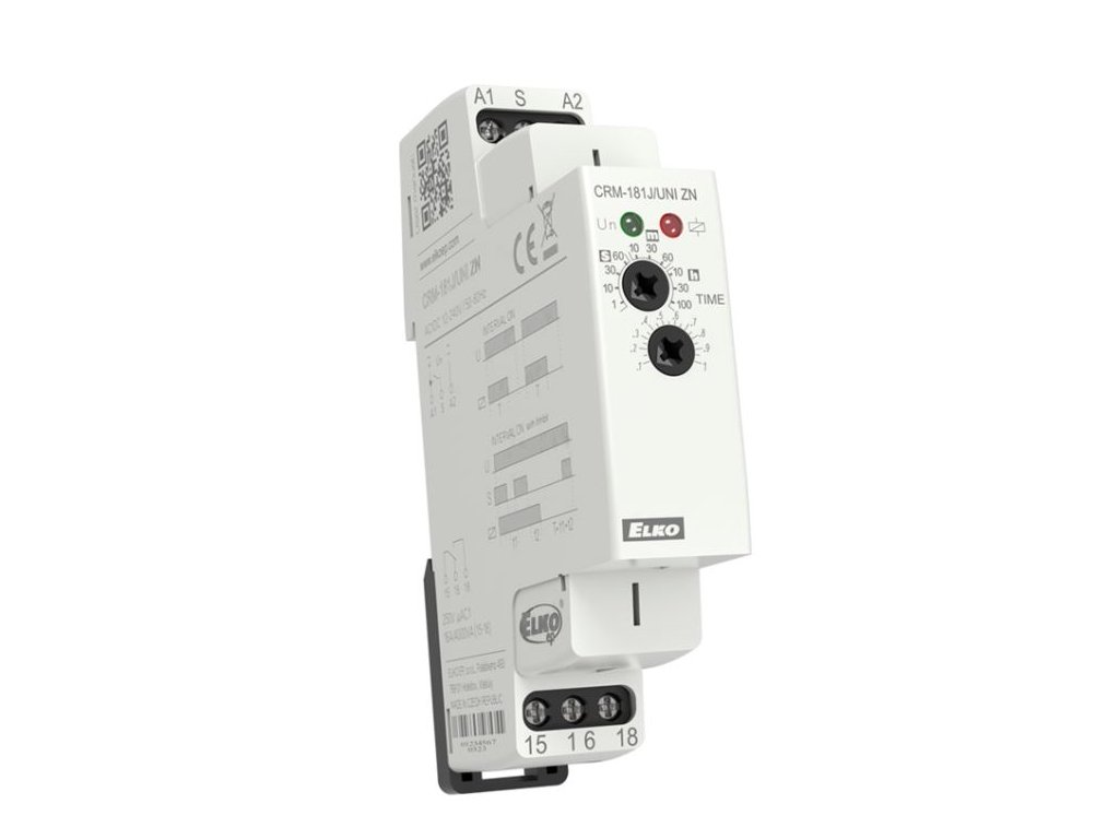 • jednofunkční časové relé jsou vhodná pro aplikace, kde je předem jasný požadavek na funkci a jsou vhodné pro univerzální využití v automatizaci, řízení a regulaci nebo v domovních instalacích • výběr ze čtyř typů: ZR, ZN, BL, OD • všechny funkce iniciované napájecím napětím mohou využít ovládací vstup k potlačení probíhajícího zpoždění (pauza) • univerzální napájecí napětí AC/DC 12 - 240 V • nastavitelný čas od 0.1 s do 100 h je rozdělen do 10-ti rozsahů: (0.1 s - 1 s / 1 s - 10 s / 3 s - 30 s / 6 s - 60 s / 1 min - 10 min / 3 min - 30 min / 6 min - 60 min / 1 h - 10 h / 3 h - 30 h / 10 h - 100 h) • výstupní kontakt: CRM-181J: 1x přepínací 16 A CRM-183J: 1x přepínací 16 A, 2x přepínací 8 A • multifunkční červená LED bliká nebo svítí v závislosti na provozním stavuDoplňkové parametry