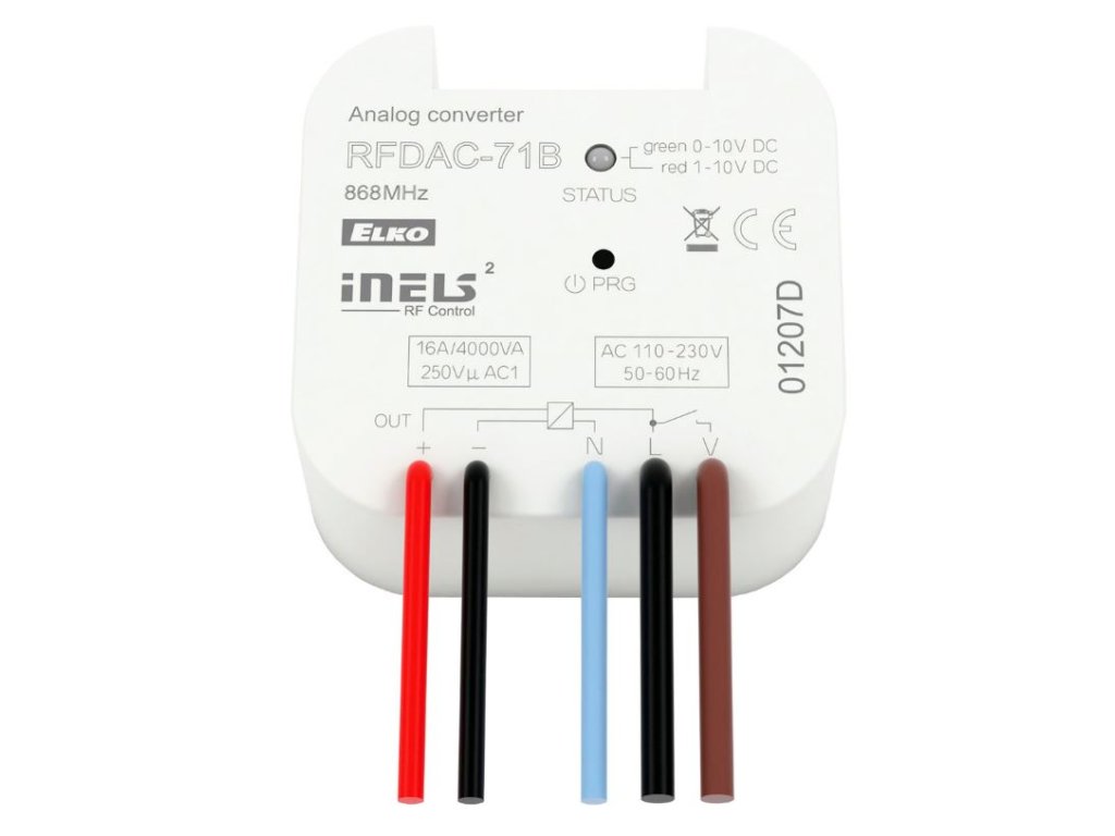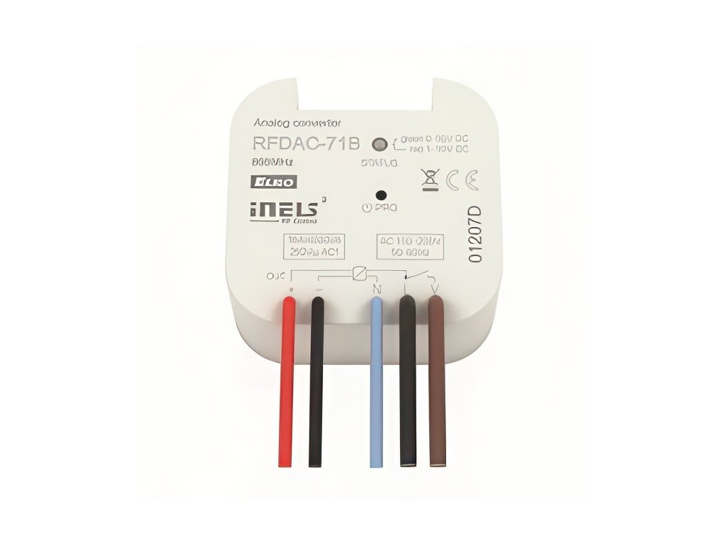 Analogový regulátor s výstupem 0(1)-10 V slouží k: a) stmívání zářivkových svítidel (pomocí stmívatelného předřadníku), b) stmívání LED panelů (při použití vhodného stmívaného zdroje až 50 ks LP-6060-3K/6K), c) regulaci termopohonů (TELVA), d) ovládání jiných regulátorů (např. výkonových stmívačů DIM-6). • Lze je kombinovat s Detektory, Ovladači nebo Systémovými prvky iNELS RF Control. • Provedení BOX nabízí montáž přímo do instalační krabice, podhledu nebo krytu svítidla. • Bezpotenciálový analogový výstup 10 mA, kontakt relé 16 A. • 6 světelných funkcí – plynulý náběh nebo doběh s časovým nastavením 2 s-30 min. • Při vypnutí se nastavená úroveň uloží do paměti a po opětovném sepnutí se vrátí na poslední nastavenou hodnotu. • Analogový regulátor může být ovládán až 25 kanály (1 kanál představuje jedno tlačítko na ovladači). • Programovací tlačítko na regulátoru slouží také jako manuální ovládání výstupu. • Napájení prvku je v rozsahu 110-230 V AC. • Možnost nastavení stavu paměti při výpadku proudu. • U prvků lze nastavit funkci opakovače (repeatru) prostřednictvím servisního zařízení RFAF/USB. • Dosah až 200 m (na volném prostranství), v případě nedostatečného signálu mezi ovladačem a prvkem použijte opakovač signálu RFRP-20 nebo prvky s protokolem RFIO2, které tuto funkci podporují. • Komunikace s obousměrným protokolem iNELS RF Control2 (RFIO2).Doplňkové parametry