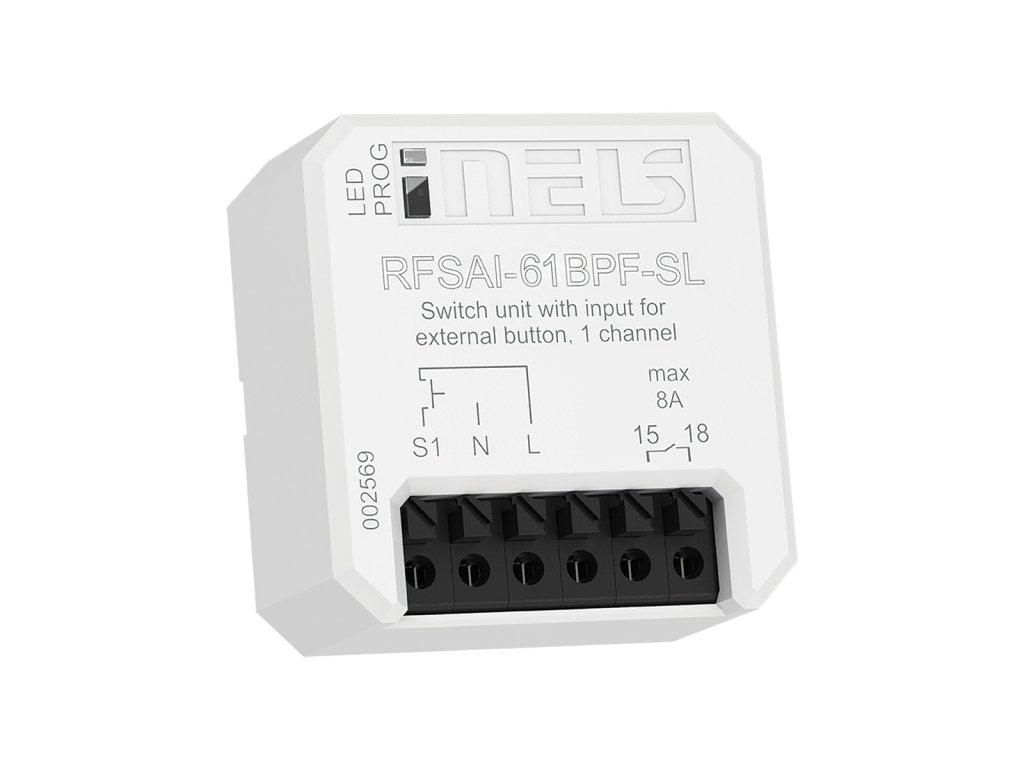 POPIS Spínací prvek s jedním / dvěma výstupními relé slouží k ovládání spotřebičů a světel. Pro ovládání lze použít vypínače/tlačítka v elektroinstalaci. Lze je kombinovat s Detektory, Ovladači nebo Systémovými prvky iNELS Wireless. Provedení BOX-SL nabízí montáž přímo do instalační krabice, podhledu nebo krytu ovládaného spotřebiče. Snadná montáž díky bezšroubovým svorkám. Umožnuje připojení spínaných zátěží s celkovým součtem 8 A (2 000 W). Funkce: u RFSAI 61B-SL, RFSAI 62B-SL a RFSAI-61BPF-SL - tlačítko, impulsní relé a časové funkce zpožděného rozběhu nebo návratu s časovým nastavením 2 s-60 min. Ke každému výstupnímu relé lze přiřadit libovolnou funkci. U RFSAI-11B-SL má tlačítko pevně danou funkci - ZAP/VYP. Externí tlačítko se přiřazuje stejně jako bezdrátové. Každý z výstupů může být ovládán až 12/12 kanály (1 kanál představuje jedno tlačítko na ovladači). U RFSAI-61B-SL, RFSAI-11B-SL a RFSAI-61BPF-SL až 25 kanály. Programovací tlačítko na prvku slouží také jako manuální ovládání výstupu. Možnost nastavení paměti stavu výstupu při výpadku a následném obnovení napájení U prvků lze nastavit funkci opakovače (repeatru) prostřednictvím servisního zařízení RFAF/USB, PC, aplikace. Dosah až 200 m (na volném prostranství), v případě nedostatečného signálu mezi ovladačem a prvkem použijte opakovač signálu RFRP-20N nebo prvky s protokolem RFIO2, které tuto funkci podporují. Komunikace s obousměrným protokolem RFIO2. Materiál kontaktu relé AgSnO2 umožňuje spínání světelných předřadníků. TECHNICKÉ PARAMETRY Výstup: 1x spínací, 8 A Napájení (frekvence): AC 230 V (50-60 Hz) Provedení: BOX Rozměry: 43 x 44 x 22 mm Protokol: RFIO2Doplňkové parametry