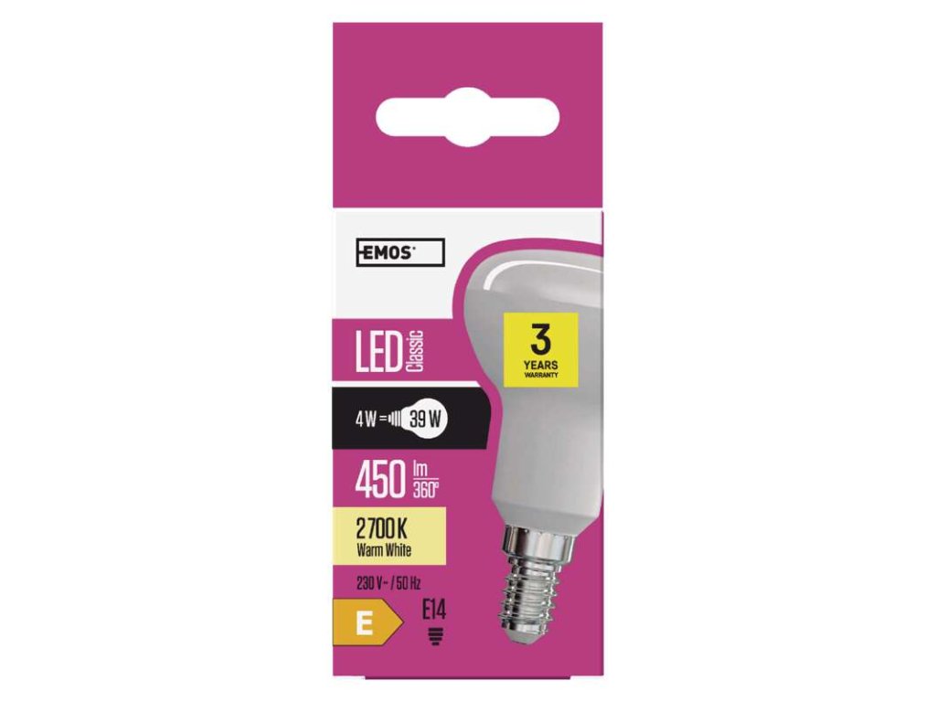 LED žárovka E14 EMOS Classic R50 4W, náhrada za 39W, barva světla teplá bílá 2700K. Produktové číslo 1525731204Doplňkové parametry