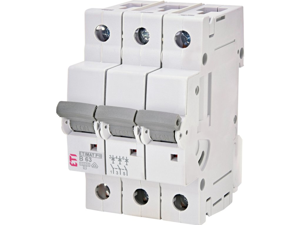 Miniature circuit breaker, ETIMAT P10 3p B63, Rated current (A) 63, Function MCB, Number of poles 3, Rated voltage (V) 400, Rated Frequency (Hz) 50/60, Rated impulse withstand voltage Uimp (kV) 6, Short circuit capacity (kA) 10, Standards IEC/EN 60898-1, IEC 60947-2, Terminals (mm2) 1-25, Tripping characteristic B, Voltage type ACDoplňkové parametry