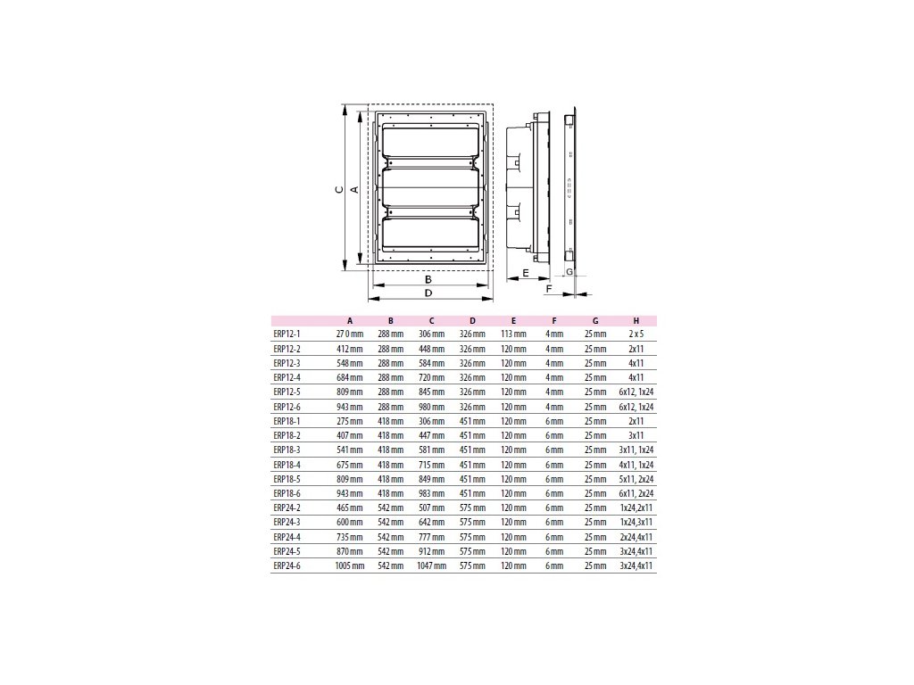 Distribution box, ERP18-5, Catalogue Group DIDO ERP, Enclosure base (material, color) Plastic, white, Door (material, color) Metal, white, Frame size (Number of rows) 5, Number of modules (Total/per row) 90 / 18, Protection Class II, IP rating IP 40, Mounting type Flush mounted, Rated voltage (V) 400, Rated current (A) 100, Number of PE/N terminals (connections) 2x24 / 5x11, Glow wire test (°C) 650Doplňkové parametry