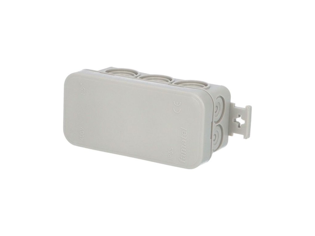 Krabice F6 - MiniBOX IP55 rozbočovací, s naklapávacím víčkem, 90x43x40mm, 6x vstup 2,5mm2, 4x vstup 1,5mm2. Elektroinstalační krabice s naklapávacím víčkem v krytí IP55, rychlá a jednoduchá montáž, odolnost proti mechanickým nárazům IK08, pro nástěnnou montáž (na omítku), pro umístění na kabelových žlabech. Barva šedá (RAL 7035), samozhášivý, bezhalogenní materiál, bez svorkovnice, otvory do krabice se provádějí odřezáním ochranné blány lámacím nožem z vnitřní strany krabice. Splňují požadavky norem ČSN EN 60670-22, zkouška žhavou smyčkou 650°C (pro montáž na hořlavé podklady je nutné použít nehořlavou podložku), pro rozsah teplot od -25°C do +85°C.Doplňkové parametry