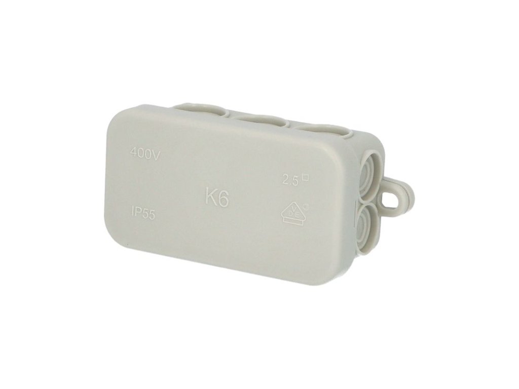 Krabice K6 IP55 rozbočovací, s naklapávacím víčkem, 80x43x36mm. Elektroinstalační krabice s naklapávacím víčkem v krytí IP55, rychlá a jednoduchá montáž, tělo krabice je vyrobeno z flexibilního plastového materiálu a víčko z tvrdého, odolnost proti mechanickým nárazům IK07, pro nástěnnou montáž (na omítku), pro umístění na kabelových žlabech, barva šedá (RAL 7035), samozhášivý, bezhalogenní, bez svorkovnice, otvory do krabice se provádějí propíchnutím vstupního otvoru nástrojem. Splňují požadavky norem ČSN EN 60670-22, zkouška žhavou smyčkou 650°C (pro montáž na hořlavé podklady je nutné použít nehořlavou podložku), pro rozsah teplot od -25°C do +85°C.Doplňkové parametry