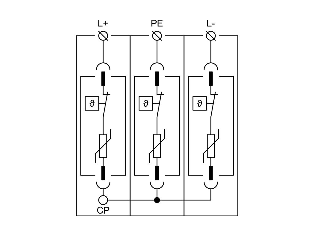 Svodiče impulzních proudů a rázového přepětí typu T1+T2 pro fotovoltaické (PV) systémy. Výrobky jsou koncipované v zapojení typu Y, které je odolné vůči zemnímu spojení pracovních vodičů. Jednotlivé varistorové sekce zapojené mezi svorky L+, L- a PE jsou opatřeny interními odpojovači, které jsou aktivovány při poruše (přehřátí) varistorů a jsou schopny přerušit DC proud. Speciální konstrukce vnitřního odpojovače dovoluje instalaci bez předřazeného předjištění. Instalují se na DC straně v PV aplikacích s vnějším LPS, kde není dodržena dostatečná vzdálenost „s“. Jsou vhodné pro hladinu LPL III nebo IV. Zajišťují vyrovnávání potenciálů plusových a mínusových sběrnic PV systémů a likvidaci transientních přepětí vznikajících při atmosférických výbojích (včetně přímého úderu blesku do PV systému) nebo spínacích procesech. Označení M specifikuje konstrukční provedení s výměnným modulem. Označení DS specifikuje provedení s dálkovou signalizací. Instaluje se dle norem: ČSN EN 62305 ed. 2, ČSN CLC/TS 50539–12, ČSN 33 2000-7-712 ed. 2.Doplňkové parametry