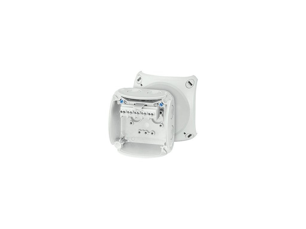 Kabelová krabicová rozvodka z vysoce kvalitního termoplastu pro nechráněnou instalaci ve venkovním prostředí nebo pro nástěnné aplikace v budovách. Odolné proti povětrnostním vlivům, jako například UV záření ze slunečního světla, chráněno proti dešťové vodě, teplotně stálé a nárazuvzdorné. Upevnění víka pomocí rychlouzávěrů. S vnějšími (stěnovými) úchyty. Odolné proti mořské vodě pro použití v přímořských oblastech. Se schválením pro instalaci na lodích. Svorkovnice se 2 svorkami na každý pól do 2,5 mm2, 5pólová. Kabelový vstup přes metrické předlisy. Montážní kabelové vývodky součástí příslušenství. S páskem pro uchycení víka.Doplňkové parametry