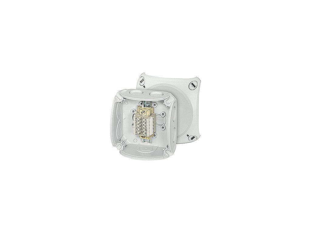 Kabelová krabicová rozvodka z vysoce kvalitního termoplastu s řadovými svorkami pro Cu vodiče. Pro nástěnné aplikace v budovách nebo chráněnou instalaci ve venkovním prostředí. Upevnění víka prostřednictvím rychlouzávěrů, se stěnovými úchyty a páskem pro uchycení víka při otevření. S 5 řadovými svorkami do 2,5 mm2. Kabelový vstup přes pružné těsnící membrány ve dně a stěnách skříně. Následné použití kabelových vývodek odstraněním těsnící membrány je možné.Doplňkové parametry