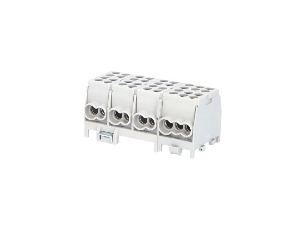 Svorkovnice rozbočovací HLAK 25 4/10 GR-S, 100A, 4pól., AL/CU, IP20, 4xŠ, na DIN /2080427. Univerzální rozbočovací (smyčkovací) svorkovnice HLAK typ M2 mohou být použity v rozváděčích nízkého napětí či v dalších aplikacích, kde potřebujeme připojit vstupní kabel a kabel(y) výstupní (smyčkování) a zároveň připojit k napájení přístroje osazeného uvnitř rozváděče. Speciální povrchová úprava svorky umožňuje připojení jak měděných tak hliníkových vodičů. Svorky jsou určeny pro montáž na nosnou lištu (DIN) a jsou řaditelné do sebe. Vodiče se do svorek po odizolování připevňují pomocí šroubového spojení. Šroub dosedá přímo na vodič, proto je nutné jemně slaněné vodiče opatřit dutinkou. Dutinka ale zvětší průřez vodiče a proto je nutné připojovat slaněné vodiče o řád menší než uvedené průřezy. U pevných vodičů toto není nutné. Hlavní přednosti: • Montáž na nosnou lištu • Ui až 1000 V AC/DC (ČSN EN 60998-1 ed. 2) • Menší rozměry oproti klasickým rozbočovacím svorkám • Krytí IP20 • Připojení měděných i hliníkových vodičů • Řaditelné do sebe • Široká nabídka typů a provedení • Barevné odlišení fází, nulového a ochranného vodičeDoplňkové parametry
