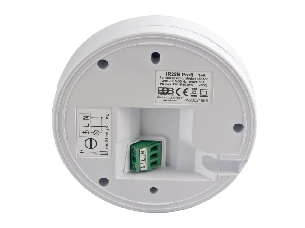 <h2> Vlastnosti stropního čidla IR28B Profi:</h2> <p> Slouží k automatickému spínání osvětlení po narušení detekčního pole v horizontální i vertikální rovině (uvnitř jsou 3 sensory). Vnitřní zapojení s ochranou proudových nárazů při spínání kapacitních zátěží zvyšuje odolnost kontaktů použitého relé. Je vhodný do míst, kde hlavním požadavkem je větší počet spínání osvětlení (schodiště, chodby, průmyslové objekty).</p> <p> </p>Doplňkové parametry