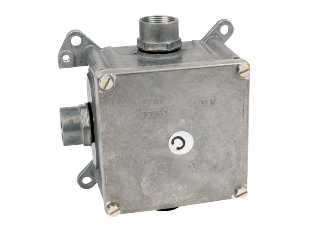 7116 B - KRABICE S IP KRYTÍM KOVOVÁ, konfigurace M20, barva KOV, balení - 1/12 ks - krabice pro rozvody s ocelovými závitovanými nebo kovovými ohebnými trubkami, 3 vývodky a jedna zátka rovnoměrně rozloženy na bocích krabice, svorkovnice není součástí krabice, osazena svorka pro provedení instalace v sítích TNSDoplňkové parametry