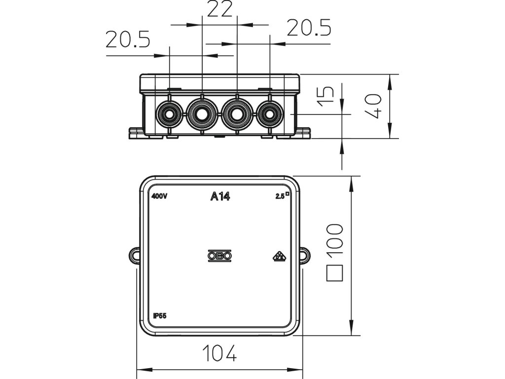 Stupeň krytí IP55, jmenovité napětí 690 V, jmenovitý průřez 2,5 mm2, 8 vývodů pro kabely o průměru 5–14 mm 8 vývodů pro kabely o průměru 5–11 mm. Svěrné víko. Rozměry: 100 × 100 × 40 mm Světlé vnitřní rozměry: 90 × 90 × 35 mm Na každých 10 krabic 1 vyřezávací nástrojDoplňkové parametry