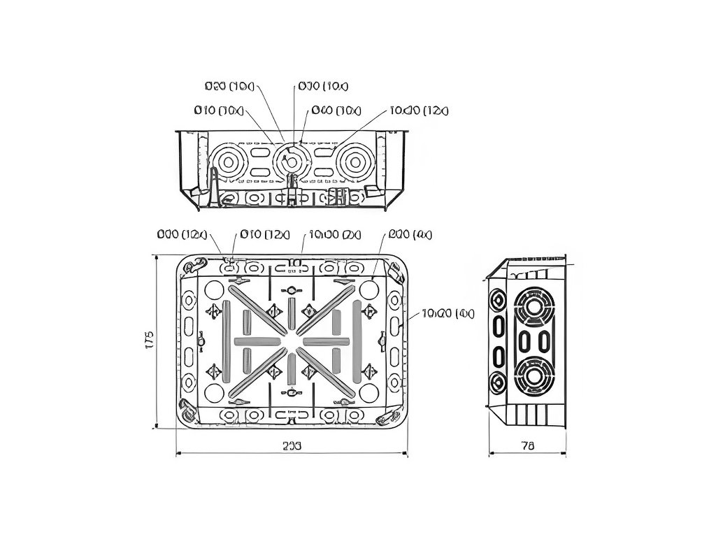 KT 250/1 - SKŘÍŇ ROZVODNÁ, konfigurace KB, barva SVĚTLE ŠEDÁ, balení - 1/12 ks - možnost nastavení víka oproti krabici do horizontální polohy, možnost vylomení boční stěny pro snadnější instalaci kabelů, možnost instalace svorkovnic, nosných lišt typu TS 35, možnost instalace ekvipotenciální svorkovniceDoplňkové parametry