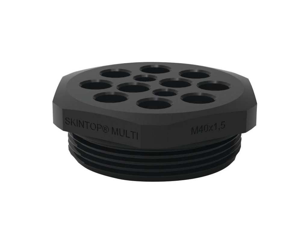 Vícenásobný vstup SKINTOP® MULTI-M 50X1.5 / 18X2-6 MM; Vícenásobný vstup; M 50; Počet kabelových vstupů: 18; Velikost klíče 1: 55; Bez halogenů; Odolnost proti UV záření; IP 67, IP 66, IP 68 - 0.1 bar (60 min); Anwendungsgebiete: Vhodný pro venkovní použití;Pro utěsněný a tahově odlehčený vícenásobný vstup nekonfekcionovaných kabelů do pouzdra ;Lze použít v suchém, vlhkém a olejovém prostředí; Nutzen: Vícenásobný vstup kabelů umožňuje vyšší hustotu osazení (až 30 kabelů podle varianty) ;Flexibilita při výběru průměru kabelu omezuje rozmanitost dílů ve skladu, což přináší logistické a nákladové výhody ;Certifikace UL podle technických údajů umožňuje použití výrobku na severoamerickém trhu;Přímý vstup kabelu bez předchozího perforování průchodek ;Velké rozsahy sevření, každý variabilní o 4 mm, pro různé průměry kabelů ;Nejlepší možné utěsnění k pouzdru a ke kabelům umožňuje stupeň krytí IP 68 ;Snadná montáž na pouzdro přišroubováním nebo upevněním pojistnou maticí ;Neobsazené prostupy zůstávají bezpečně uzavřené a utěsněné díky technologii elastického gelu s inovativní membránovou technologiíDoplňkové parametry