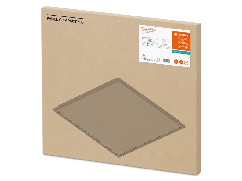Čtvercová vestavná panelová svítidla pro stropní systémy 600 x 600 mm. Vlastnosti výrobku: Rám z protlačovaného hliníku. Polystyrenový difuzor. Životnost (L80/B10): až 50 000 h (při 25 °C). Výhody výrobku: Světlo s nízkou úrovní blikání díky speciálnímu předřadníku. Úspora energie díky účinnosti systému až 110 lm/W. Externí driver s volitelným 3pólovým průchozím kabelem. K dispozici je provedení s DALI ECG. 5letá záruka. Oblasti použití: Přímá náhrada za svítidla se zářivkami. Kanceláře, konferenční místnosti. Recepce, vstupní haly, chodby, výtahy. Vhodné pro systémy zapuštěných světel do stropů o velikosti mřížky 600 × 600 mm. Výbava / příslušenství: K dispozici je příslušenství pro několik způsobů montáže. Přiloženo je bezpečnostní lanko pro svítidlo. Předinstalované bezpečnostní držáky. Včetně externího předřadníku. Vhodné pro použití se samostatným nouzovým modulem. Bezpečnostní informace: Všechna elektrická připojení musí provést kvalifikovaná osoba.. Pozor – nebezpečí úrazu elektrickým proudem.. Svítidla nejsou vhodná pro pokrytí tepelně izolačním materiálem..Doplňkové parametry