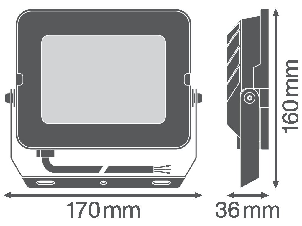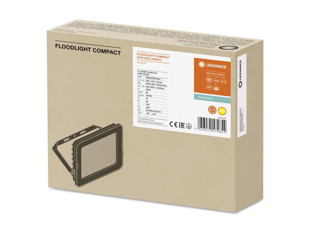 Reflektor se světelným výkonem až 5 000 lm. Vlastnosti výrobku: Symetrické vyzařování na základě technologie reflektorů s úhlem vyzařování 100° × 100°. Montážní konzola s 30° úhlem a širokou rotační plochou. Předinstalovaný flexibilní 1m kabel (H05RN-F), 3 × 1,0 mm2 jednotlivé vodiče, obalené. Výhody výrobku: Robustní, přesto lehký a kompaktní design. Bezpečné a velmi rovnoměrné osvětlení díky difuzoru s matným a tvrzeným sklem. Nulová hodnota horní účinnosti svítidla (ULOR 0 %) při montáži v náklonu 0°. Úspora energie až 90 % ve srovnání s halogenovými reflektory. 3letá záruka. Oblasti použití: Náhrada za reflektory s halogenovými žárovkami. Venkovní použití (IP66). Veřejné prostory. Fasády budov. Zahrady, balkony a další venkovní prostory. Stavební plochy. Bezpečnostní informace: Externí flexibilní kabel tohoto svítidla nelze vyměnit. Pokud je kabel poškozen, je nutné svítidlo vyřadit z provozu a zlikvidovat ho.. Svorkovnice není součástí dodávky. Instalaci musí provést kvalifikovaná osoba.. Pozor – nebezpečí úrazu elektrickým proudem.. Výrobek v třídě ochrany I. Všechny elektricky vodivé, kovové části pouzdra, které mohou během provozu nebo údržby v případě poruchy absorbovat napětí, musí být trvale připojeny k ochrannému zemnicímu vodiči..Doplňkové parametry