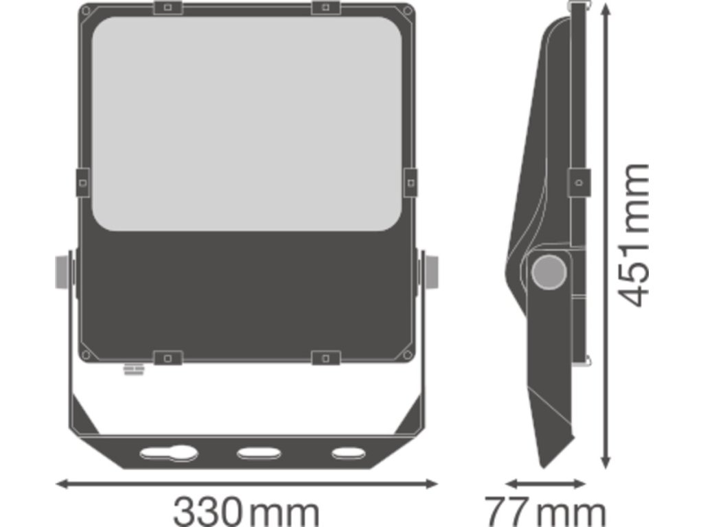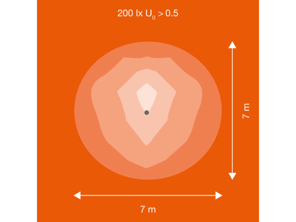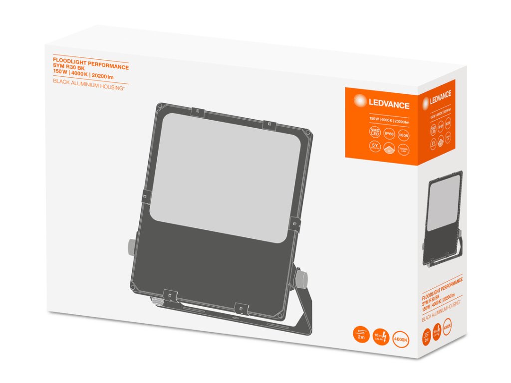 Svítidlo Floodlight s otočným symetrickým vyzařováním pro osvětlování prostor z vysokých sloupů. Vlastnosti výrobku: Vysoká světelná účinnost: až 140 lm/W. Otočné symetrické vyzařování pro osvětlování prostor z vysokých sloupů. Montáž pod úhlem (45°) a náklon až 180°. Stupeň krytí: IP66. Odolnost proti nárazu: IK08. Okolní teplota při provozu: –30…+50 °C. Vysoká ochrana proti přepětí: až 10 kV (L/N-PE), 6 kV (L-N). Integrovaný odvzdušňovací otvor zabraňující vzniku kondenzace uvnitř svítidla. Připojení prostřednictvím 2m kabelu, nutná elektroinstalace. Výhody výrobku: Úspora energie až 90 % ve srovnání s halogenovými reflektory. Úspora energie až 45 % v porovnání se svítidly s tradičními výbojkami. Jasné, robustní a odolné. Rovnoměrný rozptyl světla a minimální oslnění. Nulová hodnota horní účinnosti svítidla (ULOR 0 %) při montáži v náklonu 0°. Montážní otvor pro snadnost instalace. 5letá záruka. Oblasti použití: Přímá náhrada za svítidla používající HID světelné zdroje. Venkovní použití (IP66). Parkoviště. Veřejné prostory. Průmysl. Sportovní zařízení. Osvětlení velkých prostranství. D-značky podle EN 60598-2-24 pro komerční jednotky s nebezpečím požáru, např. kvůli hromadění prachu. Bezpečnostní informace: Všechna elektrická připojení musí provést kvalifikovaná osoba.. The external flexible cable or cord of this luminaire cannot be replaced; if the cord is damaged, the luminaire shall be destroyed.. Svorkovnice není součástí dodávky. Instalaci musí provést kvalifikovaná osoba.. Pozor – nebezpečí úrazu elektrickým proudem.. Výrobek v třídě ochrany I. Všechny elektricky vodivé, kovové části pouzdra, které mohou během provozu nebo údržby v případě poruchy absorbovat napětí, musí být trvale připojeny k ochrannému zemnicímu vodiči..Doplňkové parametry