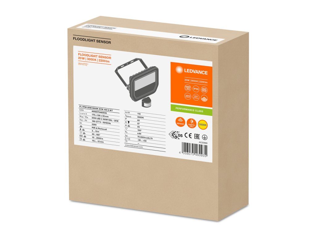 Reflektor s flexibilním snímačem pohybu a denního světla, světelný výkon až 2400 lm. Vlastnosti výrobku: Flexibilní senzor pohybu a denního světla. Senzor: úhel záběru 350°, úhel náklonu 180°. Symetrické vyzařování na základě technologie reflektorů s úhlem vyzařování 100° × 100°. Integrovaný předřadník s širokým rozsahem napětí, vhodný pro 100 - 277 V AC. Ochrana proti přepětí: až 4 kV (L/N-PE), 2 kV (L-N). Montážní konzola s 30° úhlem a širokou rotační plochou. Předinstalovaný flexibilní 1m kabel (H05RN-F), 3 × 1,0 mm2 jednotlivé vodiče, obalené. Výhody výrobku: Jasné, robustní a odolné. Optimalizované osvětlení podle požadavků díky flexibilnímu a programovatelnému senzoru. Snadné nastavení rozsahu čidla, detekce denního světla a doby trvání. Přepis vždy zapnuto, aktivace pomocí speciálního vzoru síťového spínání. Bezpečné a velmi rovnoměrné osvětlení díky difuzoru s matným a tvrzeným sklem. Úspora energie až 90 % ve srovnání s halogenovými reflektory. 5letá záruka. Oblasti použití: Náhrada za reflektory s halogenovými žárovkami. Venkovní použití (IP66). Veřejné prostory. Fasády budov. Stavební plochy. Zahrady, balkony a další venkovní prostory.Doplňkové parametry