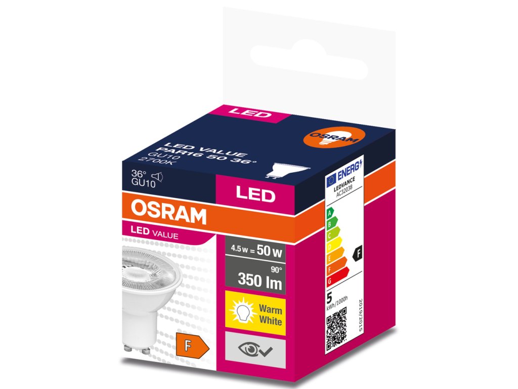 LED reflektorové žárovky PAR16 s konvenční kolíkovou paticí. Vlastnosti výrobku: LED alternativa k vysokonapěťovým halogenovým světelným zdrojům. Nestmívatelné. Patice: GU10. Dobrá kvalita světla, index podání barev Ra: ? 80. Žárovka vyrobená z plastu. Výhody výrobku: Rychlá, snadná a bezpečná výměna bez přepojování. Design, rozměry, světelný tok srovnatelné s žárovkou nebo halogenovou žárovkou. Nízké náklady na údržbu díky dlouhé životnosti. Žádné UV a nízké infračervené záření ve světelném kuželu. Okamžitě 100 % světla, bez náběhu. Oblasti použití: Prodejny a výstavní prostory. Domácí použití. Komerční použití. Zvýrazňující osvětlení. Venkovní použití pouze ve venkovních svítidlech (minimálně IP65).Doplňkové parametry