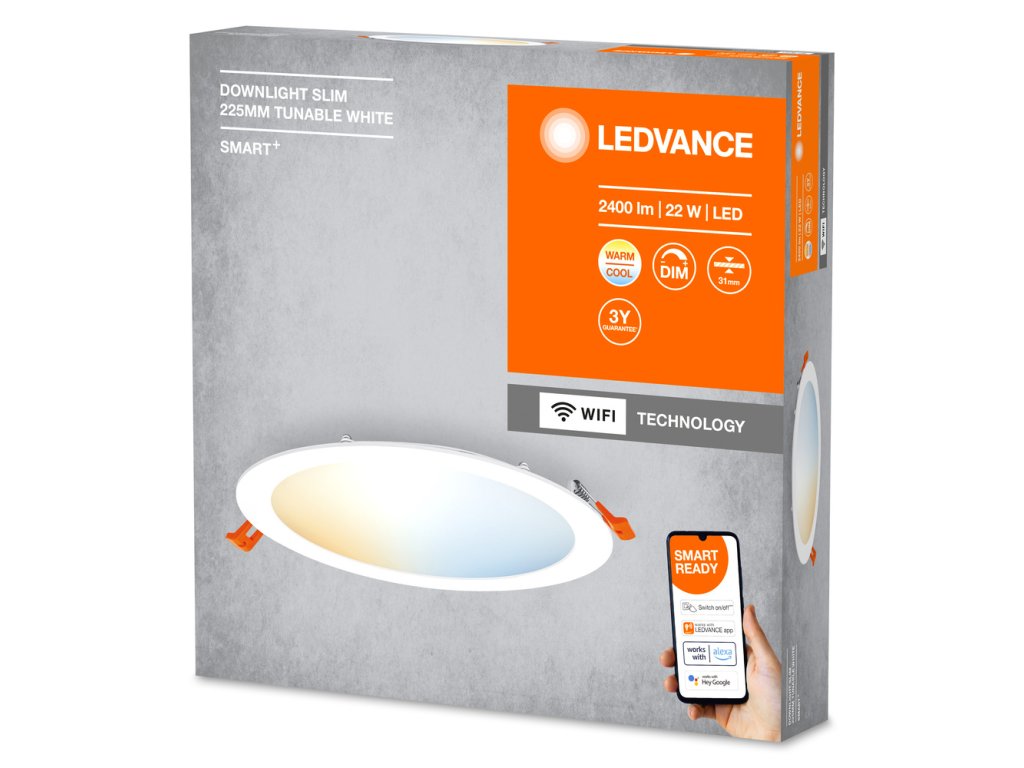 Chytré, zapuštěné tenké svítidlo s integrovaným driverem, TW, stmívatelné. Vlastnosti výrobku: Integrovaný driver. Ovladatelné pomocí aplikace LEDVANCE SMART+ (minimálně Android 8.0 nebo iOS 14.0). Možnost hlasového ovládání: Google Assistant nebo Amazon Alexa. Nastavitelná teplota chromatičnosti pomocí laditelné bílé: 3 000…6 500 K. Stmívatelné. Síťový protokol: WIFI. Materiál korpusu: plast. Výhody výrobku: Velmi tenká konstrukce. Ideální, když je na stropě málo místa. Oblasti použití: Použití uvnitř. Chodby, vstupy, schodišťě, obývací pokoje, suterény. Ložnice. Kuchyně. Výbava / příslušenství: Pro ovládání pomocí aplikace LEDVANCE SMART+ je zapotřebí chytrý telefon nebo tablet (minimálně Android 8.0 nebo iOS 14.0). Včetně kompletního příslušenství pro montáž a zapojení. Bezpečnostní informace: Všechna elektrická připojení musí provést kvalifikovaná osoba.. Pozor – nebezpečí úrazu elektrickým proudem.. Svítidla nejsou vhodná pro pokrytí tepelně izolačním materiálem.. Zkontrolujte vhodnost stěn a stropů. Pokud si nejste jisti, vyhledejte odbornou radu..Doplňkové parametry