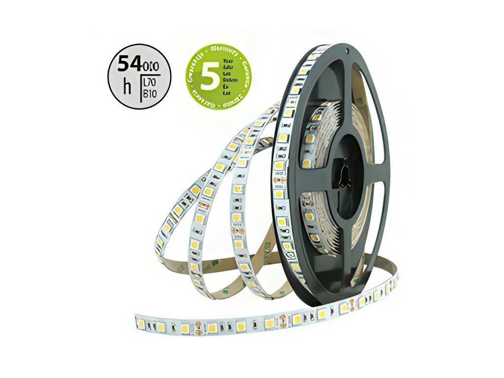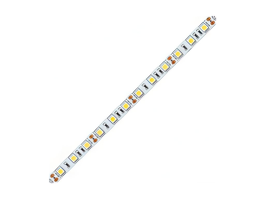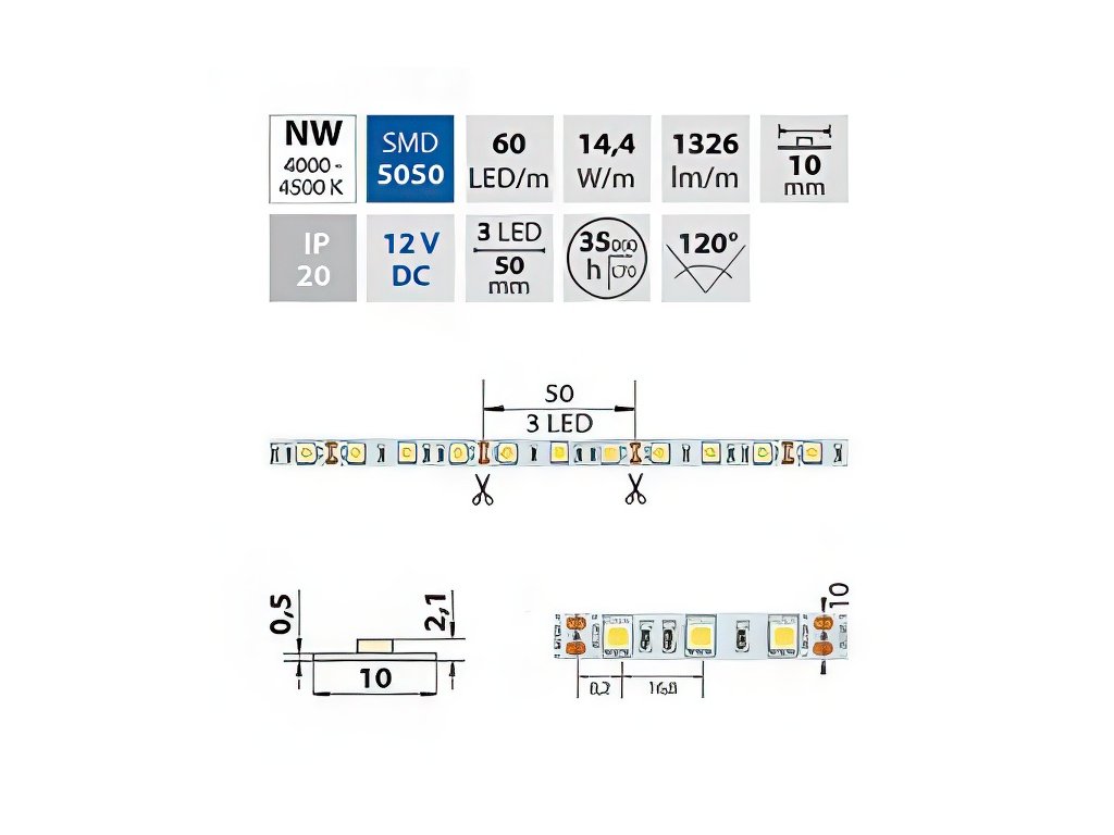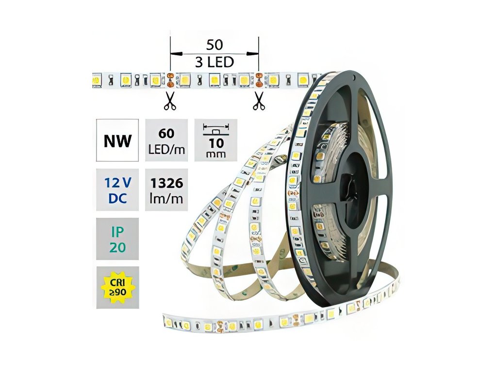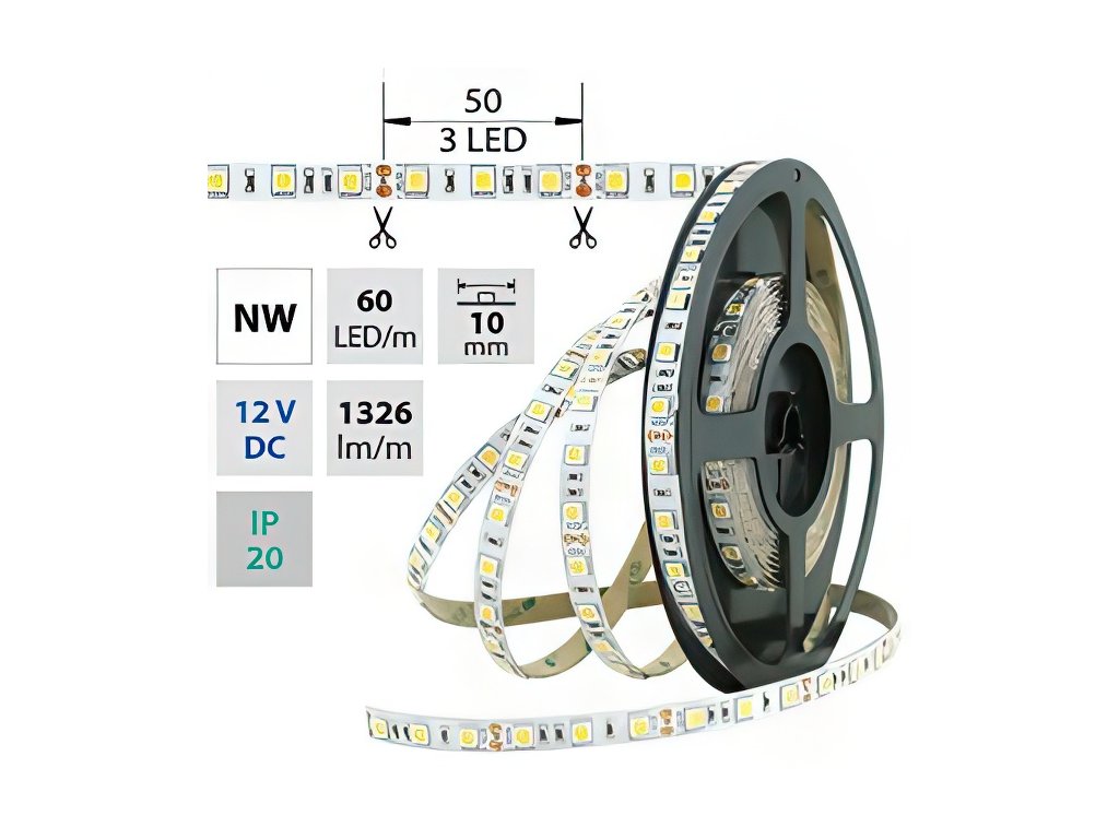 LED pásek SMD5050, neutrálně bílá (4200K), 14,4W, 60LED, 1296lm/m, segment 50mm, 3LED/segment, IP20, DC 12V, životnost 54000h, šíře 10mm, bílý PCB pásek, max. délka pásku při jednostranném zapojení: 5m, opatřen samolepící páskou 3M, UV stabilní.Doplňkové parametry