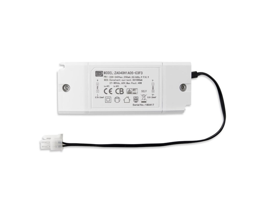 Neregulovatelný SELV zdroj konstantního proudu k LED panelům Office. Maximální výkon 40W, PF 0,9, výstupní napětí DC27-38V, výstupní proud 1050mA. Rozměry 115x45x30 mm, IP20, materiál: plast. Zdroj disponuje integrovanou ochranou proti zkratu i přetížení.Doplňkové parametry