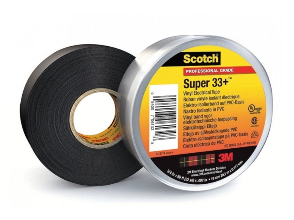 Scotch® Super 33+™ Vinylová elektrotechnická páska je originální izolační PVC páska špičkové kvality, která je určena pro primární elektroizolaci pro všechny vodiče a kabelové spoje až do napětí 600 V a teploty 105 °C. Tato profesionální páska kombinací elastického podkladu a velmi účinného lepidla poskytuje elektrickou a mechanickou ochranu nepropouštějící vlhkost při minimálním množství krycího materiálu. Má vynikající odolnost proti otěru, kyselinám, zásadám a měděné korozi. Tato páska je vhodná pro aplikace v chladných podmínkách do -18 °C, kdy zůstává vysoce tvarovatelná a pružná, aniž by se stala křehkou. Zachovává si vysokou úroveň výkonu při teplotě okolního prostředí až 105 °C. Super 33+ páska má certifikaci UL, CDA a VDE.Doplňkové parametry