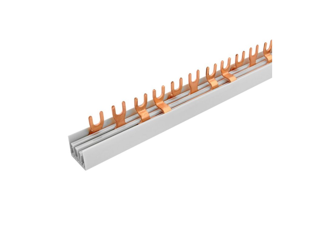 Propojovací lišta G-4L-1000/10 lišta, vidlička, 4pól., 63A, rozteč 17,8mm, 10mm2, 1m, přip. míst = 56, pro šroub M5-M6, koncovka EK-C-4/10.Propojovací fázové lišty umožňují propojení modulových přístrojů (např. jističů, chráničů, modulových vypínačů apod.) jednoduchým a profesionálním způsobem. Standardní délky lišt jsou 210 mm (propojení 12ti modulů) nebo 1 metr. Tyto standardní rozměry lze libovolně krátit (konce lišt doporučujeme osadit plastovými koncovkami). Ve srovnání s klasickou instalací pomocí kabelových mostů nabízí propojovací lišty následující výhody:• spolehlivé přiřazení fází• zpřehlednění rozváděče• rychlejší instalace - úspora času• kompaktní rozměryDoplňkové parametry