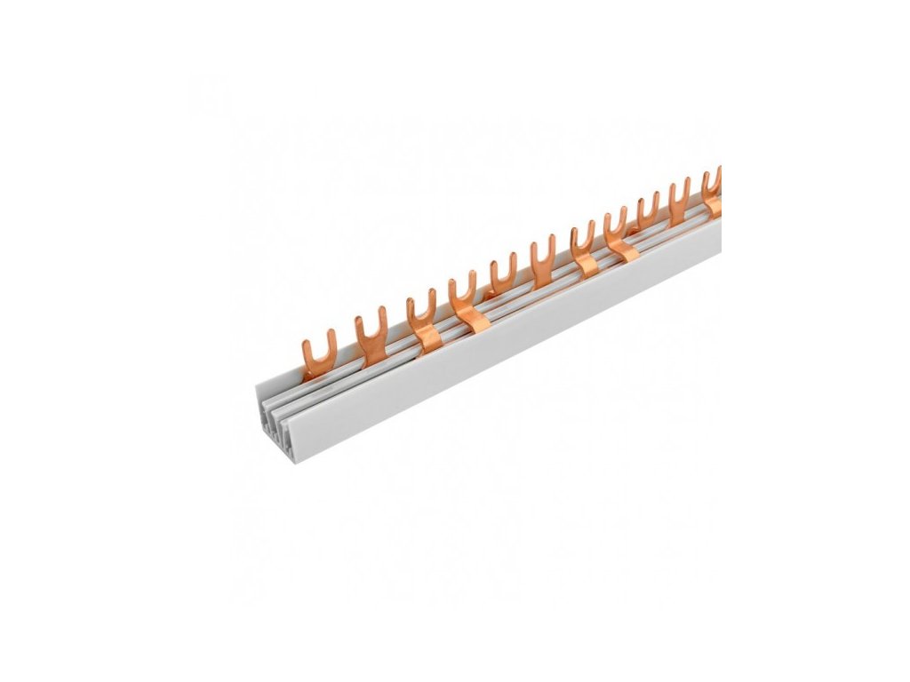 Propojovací lišta G-4L-1000/16, vidlička, 4pól., 80A, rozteč 17,8mm, 16mm2, 1000mm, přip. míst = 56, pro šroub M5-M6, koncovka EK-C-4/16.Propojovací fázové lišty umožňují propojení modulových přístrojů (např. jističů, chráničů, modulových vypínačů apod.) jednoduchým a profesionálním způsobem. Standardní délky lišt jsou 210 mm (propojení 12ti modulů) nebo 1 metr. Tyto standardní rozměry lze libovolně krátit (konce lišt doporučujeme osadit plastovými koncovkami). Ve srovnání s klasickou instalací pomocí kabelových mostů nabízí propojovací lišty následující výhody:• spolehlivé přiřazení fází• zpřehlednění rozváděče• rychlejší instalace - úspora času• kompaktní rozměryDoplňkové parametry