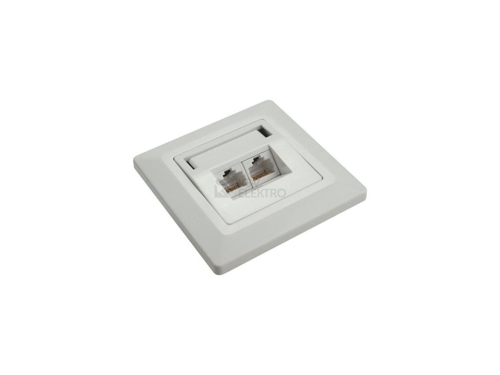Zásuvka pod omítku vybavena dvěma porty RJ45, UTP, kat. 5E. Úhel portů je 45°, pro šetrnější vedení patch kabelů od zásuvky. Pro zařezávání kabelů je zásuvka vybavena svorkovnicí typu Krone 8p8c. Barevné provedení bílé. Rozměry 80 x 80 mm.Doplňkové parametry