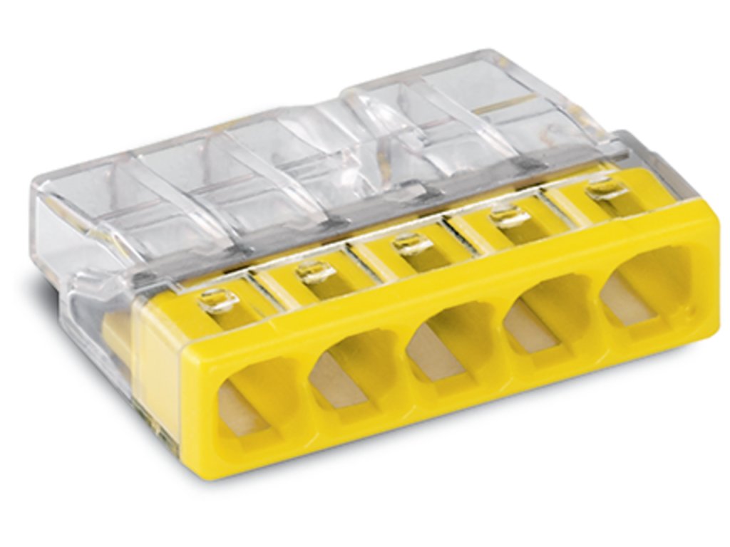 Instalační svorka PUSH WIRE®; Pro plné vodiče; Max. 2,5 mm2; 5vodič.; Barva pouzdra transparentní; Barva krytu žlutá; Okolní teplota: max. 60 °C (T60); 2,50 mm2; TransparentníDoplňkové parametry