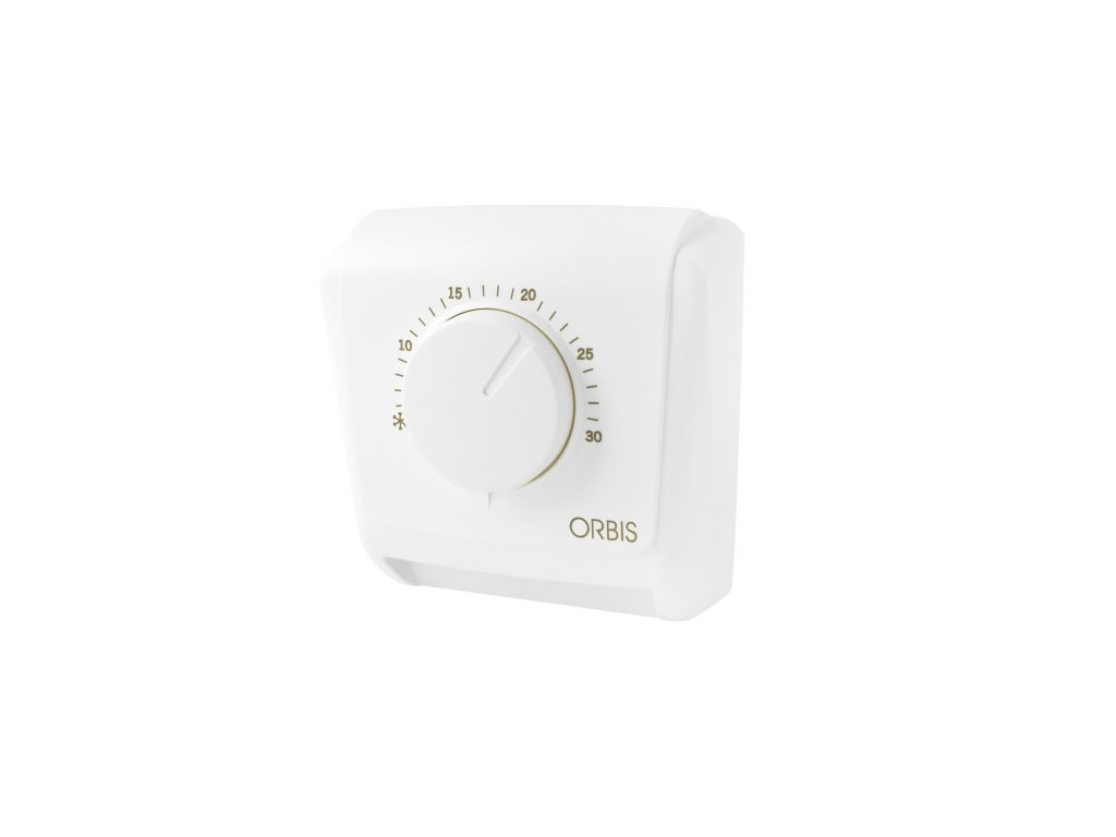 Termostat ORBIS CLIMA MLI, pokojový, mechanický, maximální zatížení kontaktů 10A (1,5A) 250V AC, montáž na povrch / do přístrojové krabičky, krytí IP20. Termostat CLIMA MLI má manuální přepínač s funkcí zapnutí nebo vypnutí termostatu. Termostaty ORBIS jsou určené k automatické regulaci topení a klimatizace s cílem udržet stálou teplotu daného prostředí. Základní nabízené typy termostatů ORBIS CLIMA s denním režimem jsou jednoduché regulátory bez potřeby napájení s mechanickým nastavovacím prvkem (kolečkem), instalují se na povrch (na elektroinstalační krabici 68 mm). Digitální termostaty ORBIS buďto s denním nebo s týdenním režimem jsou napájeny tužkovými bateriemi a jsou ovládany tlačítky nebo přímo dotykově na displej, instalují se na povrch (na elektroinstalační krabici 68 mm).Doplňkové parametry