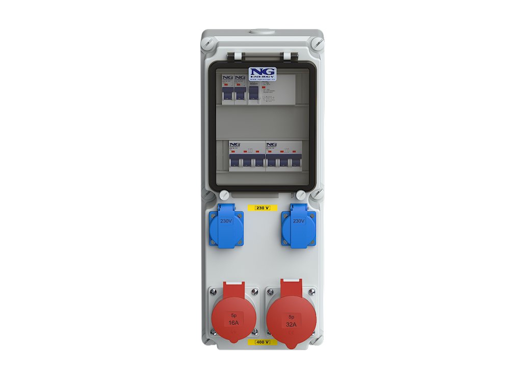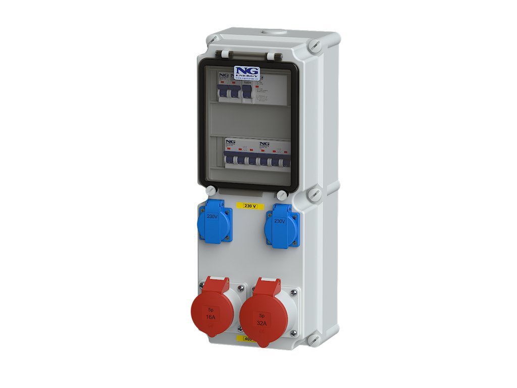 Zásuvky: 1x 32A/400V/5p, 1x 16A/400V/5p, 2x 230V s ochr. kolíkem (česká), Jištění: 2x 16A/1P/B 10 kA, 1x 16A/3P/C 10 kA, 1x 32A/3P/C 10 kA, Proudový chránič: 1x 40A/4P/30mA 10kA, V souladu s normou: ČSN EN 61439-3, Stupeň ochrany krytem: IP44, Jmenovitý proud: 40A, Jmenovité napětí: 400V, Teplotní rozsah použití: -25°C +40°C, Provedení: Nástěnné, Použití: Nástěnné, Pouzdro typ: BALS 6129, Materiál pouzdra: Polykarbonát, Materiál okénka: Polykarbonát, Počet okének: 1, Počet modulů pro přístroje: 16 (2x8) modulů, Barva pouzdra: šedá, Vývodka: 1x MV-32 IP68 (předvrtaný otvor uzavřen záslepkou, vývodka součást balení), Logistické údaje: EAN: 8595169551897, Hmotnost: 4,72 kg, Rozměry použitého pouzdra: 460x180x171. Standardní řada zásuvkových kombinací v polykarbonátových pouzdrech, určená i pro náročné prostředí dílen a staveb. Výběr pouzder nabízí dostatečnou variabilitu i pro náročnější sestavy. Lze vytvářet i přenosné varianty s madlem, s přívodkou či přívodním kabelem. Stejně jako v jiných řadách NG ENERGY je i zde součástí bezpečné a přehledné instalace dvojitá smyčkovací svorkovnice (s výjimkou ekonomických variant). UV-odolný materiál, bezšroubové zásuvky Bals a snadné připojení i smyčkování tvoří základ vedoucí pozice na trhu běžných zásuvkových kombinací. KLÍČOVÉ VLASTNOSTI: pouzdro z vysoce kvalitního, nárazuvzdorného a UV stabilního polykarbonátu, odolné vůči stárnutí, extrémním teplotám, vysoká chemická odolnost, bezhalogenní, samozhášivé, uzamykatelné a plombovatelné kryty přístrojů, přehledné prodrátování, volitelně dvojitá připojovací svorkovnice, volitelně vnější zemnící bod, celkové krytí až IP65. Na základě vašich individuálních požadavků je možné vytvořit jakoukoliv konfiguraci!Doplňkové parametry